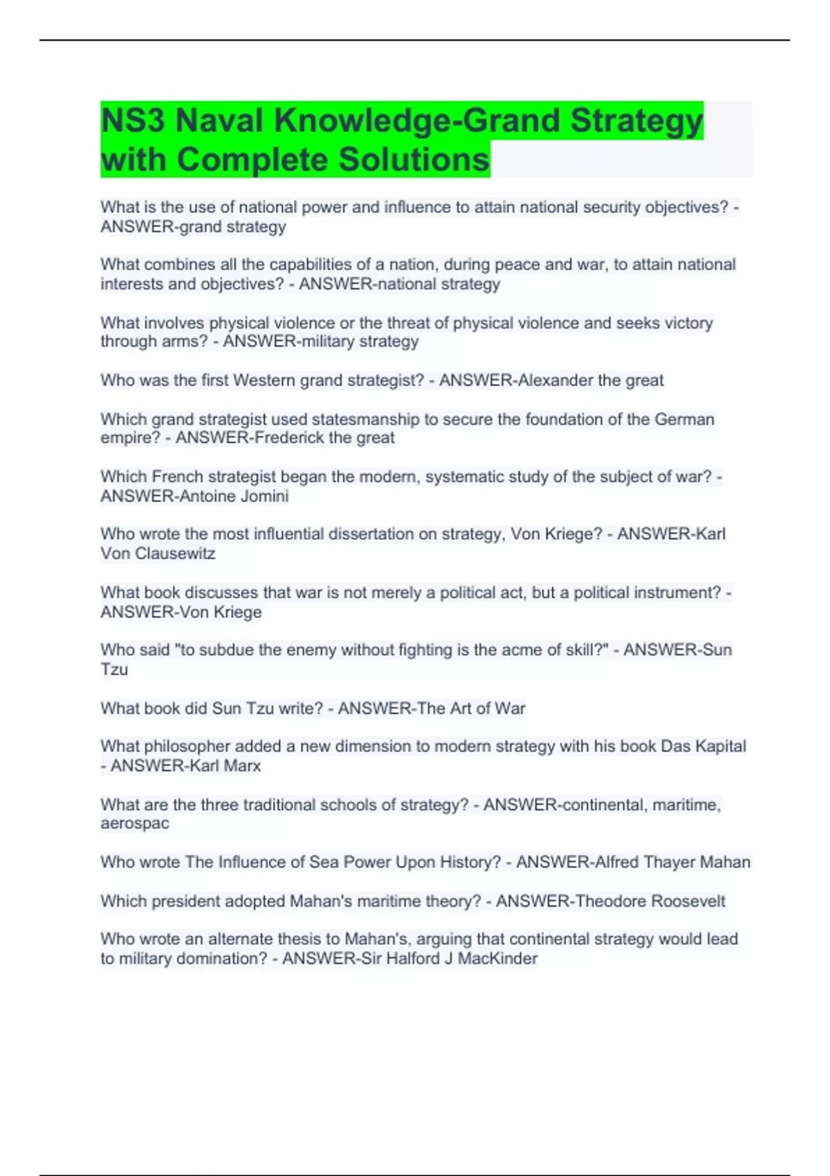 What is the use of national power and influence to attain national security objectives? - ANSWER-grand strategy What combines all the capabilities of a nation, during peace and war, to attain national interests and objectives? - ANSWER-national strategy What involves physical violence or the threat of physical violence and seeks victory through arms? - ANSWER-military strategy Who was the first Western grand strategist? - ANSWER-Alexander the great Which grand strategist used statesmanship to secure the foundation of the German empire? - ANSWER-Frederick the great Which French strategist began the modern, systematic study of the subject of war? - ANSWER-Antoine Jomini Who wrote the most influential dissertation on strategy, Von Kriege? - ANSWER-Karl Von Clausewitz What book discusses that war is not merely a political act, but a political instrument? - ANSWER-Von Kriege Who said "to subdue the enemy without fighting is the acme of skill?" - ANSWER-Sun Tzu What book did Sun Tzu write? - ANSWER-The Art of War What philosopher added a new dimension to modern strategy with his book Das Kapital - ANSWER-Karl Marx What are the three traditional schools of strategy? - ANSWER-continental, maritime, aerospac Who wrote The Influence of Sea Power Upon History? - ANSWER-Alfred Thayer Mahan Which president adopted Mahan's maritime theory? - ANSWER-Theodore Roosevelt Who wrote an alternate thesis to Mahan's, arguing that continental strategy would lead to military domination? - ANSWER-Sir Halford J MacKinder