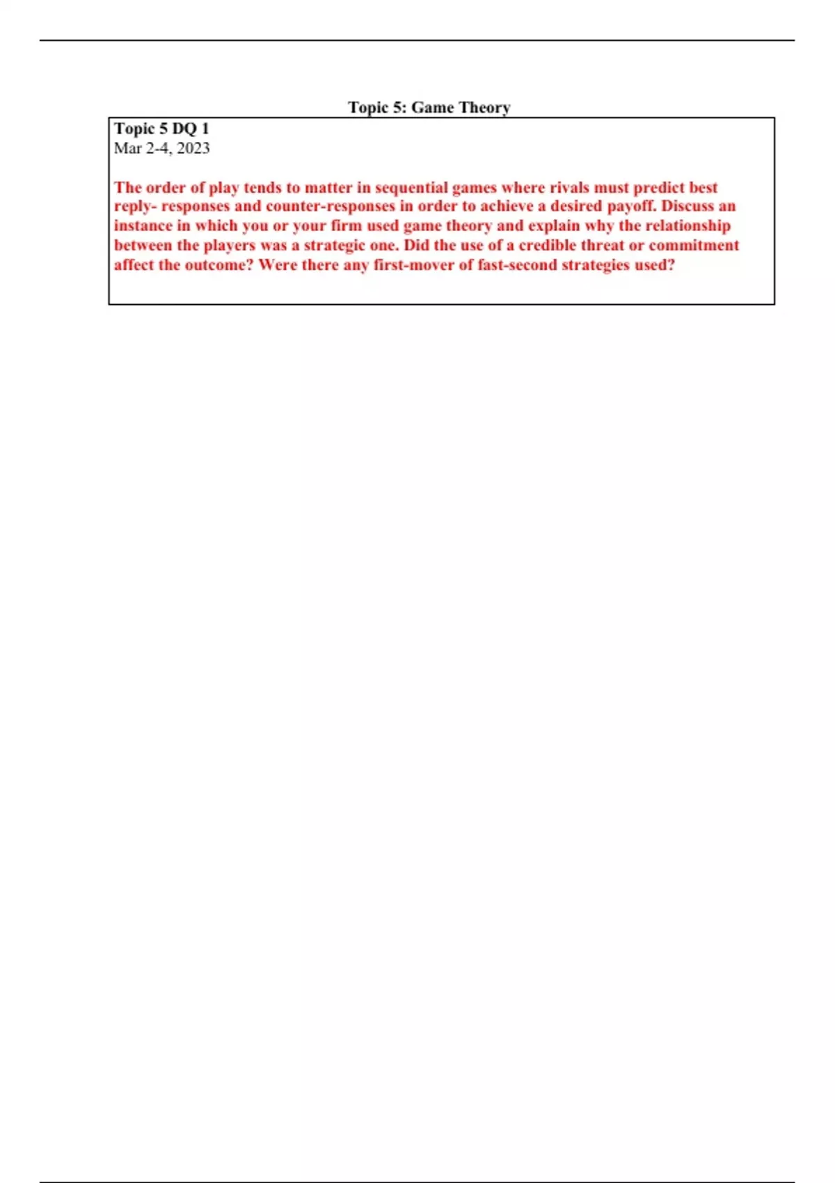 Topic5DQ1 Mar2-4, 2023 The order of play tends to matter in sequential games where rivals must predict best reply-responses and counter-responses in order to achieve a desired payoff. Discuss an instance inwhich you or your firm used game theory and explain why the relationship between the playerswas a strategic one. Did the use of a credible threat or commitment affect the outcome? Werethere any first-mover offast-secondstrategiesused?