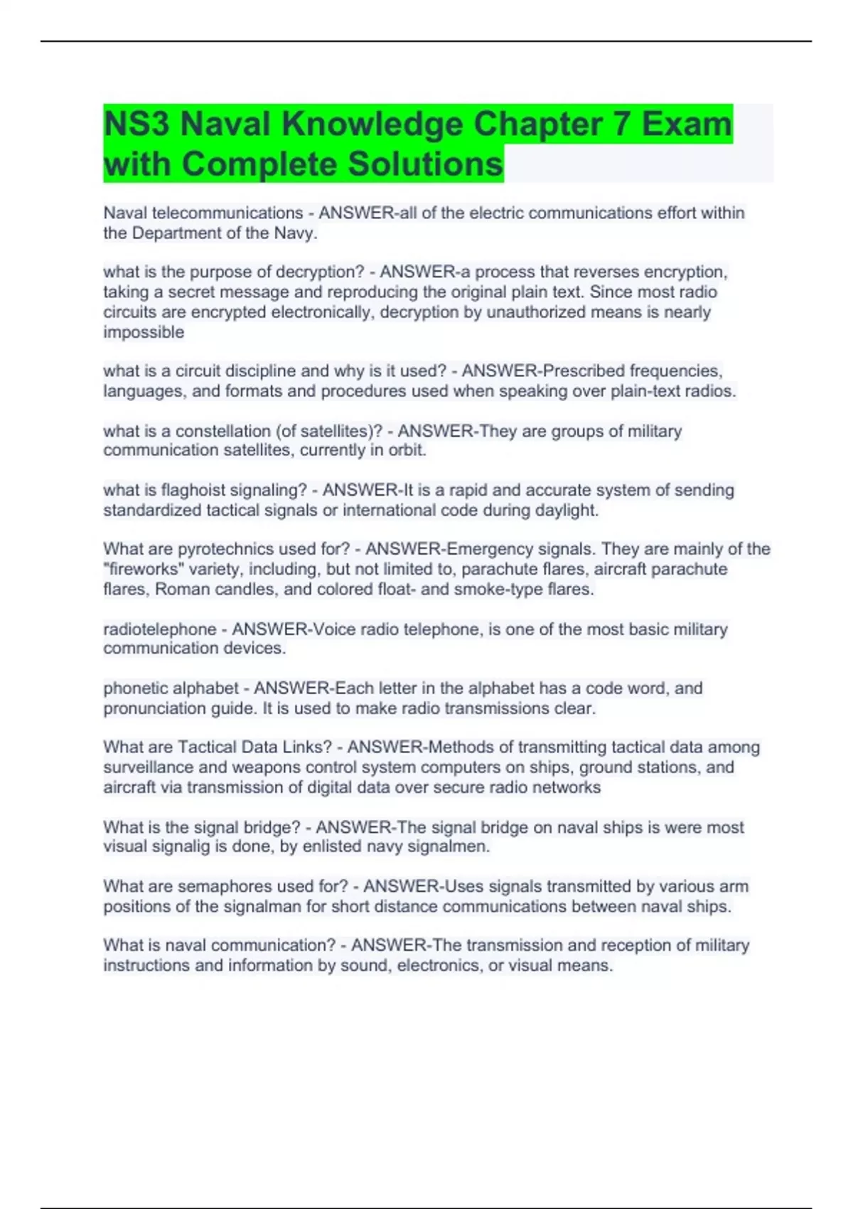 Naval telecommunications - ANSWER-all of the electric communications effort within the Department of the Navy. what is the purpose of decryption? - ANSWER-a process that reverses encryption, taking a secret message and reproducing the original plain text. Since most radio circuits are encrypted electronically, decryption by unauthorized means is nearly impossible what is a circuit discipline and why is it used? - ANSWER-Prescribed frequencies, languages, and formats and procedures used when speaking over plain-text radios. what is a constellation (of satellites)? - ANSWER-They are groups of military communication satellites, currently in orbit. what is flaghoist signaling? - ANSWER-It is a rapid and accurate system of sending standardized tactical signals or international code during daylight. What are pyrotechnics used for? - ANSWER-Emergency signals. They are mainly of the "fireworks" variety, including, but not limited to, parachute flares, aircraft parachute flares, Roman candles, and colored float- and smoke-type flares. radiotelephone - ANSWER-Voice radio telephone, is one of the most basic military communication devices. phonetic alphabet - ANSWER-Each letter in the alphabet has a code word, and pronunciation guide. It is used to make radio transmissions clear. What are Tactical Data Links? - ANSWER-Methods of transmitting tactical data among surveillance and weapons control system computers on ships, ground stations, and aircraft via transmission of digital data over secure radio networks What is the signal bridge? - ANSWER-The signal bridge on naval ships is were most visual signalig is done, by enlisted navy signalmen. What are semaphores used for? - ANSWER-Uses signals transmitted by various arm positions of the signalman for short distance communications between naval ships. What is naval communication? - ANSWER-The transmission and reception of military instructions and information by sound, electronics, or visual means.