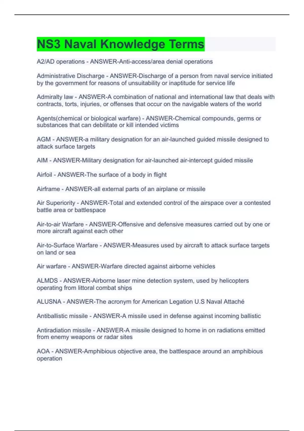 A2/AD operations - ANSWER-Anti-access/area denial operations Administrative Discharge - ANSWER-Discharge of a person from naval service initiated by the government for reasons of unsuitability or inaptitude for service life Admiralty law - ANSWER-A combination of national and international law that deals with contracts, torts, injuries, or offenses that occur on the navigable waters of the world Agents(chemical or biological warfare) - ANSWER-Chemical compounds, germs or substances that can debilitate or kill intended victims AGM - ANSWER-a military designation for an air-launched guided missile designed to attack surface targets AIM - ANSWER-Military designation for air-launched air-intercept guided missile Airfoil - ANSWER-The surface of a body in flight Airframe - ANSWER-all external parts of an airplane or missile Air Superiority - ANSWER-Total and extended control of the airspace over a contested battle area or battlespace Air-to-air Warfare - ANSWER-Offensive and defensive measures carried out by one or more aircraft against each other Air-to-Surface Warfare - ANSWER-Measures used by aircraft to attack surface targets on land or sea Air warfare - ANSWER-Warfare directed against airborne vehicles ALMDS - ANSWER-Airborne laser mine detection system, used by helicopters operating from littoral combat ships ALUSNA - ANSWER-The acronym for American Legation U.S Naval Attaché Antiballistic missile - ANSWER-A missile used in defense against incoming ballistic Antiradiation missile - ANSWER-A missile designed to home in on radiations emitted from enemy weapons or radar sites AOA - ANSWER-Amphibious objective area, the battlespace around an amphibious operation Aquaculture - ANSWER-The science of farming the sea for fish or planets Area defense - ANSWER-Protection of an entire formation of ships or land or sea area ARG - ANSWER-Amphibious ready group, comprised of ships of the amphibious task force and the landing force they carry Articulated tug - ANSWER-A tug that uses mechanical swivels to connect to its barges ASROC - ANSWER-Antisubmarine rocket, fitted with a homing torpedo warhead Asylum - ANSWER-Protection and sanctuary granted by a sovereign state to a foreign national who seeks protection because of persecution based on race, religion, nationality or political affiliation Asymmetric warfare - ANSWER-Warfare between adversaries of greatly differing strengths wherein the weaker opponent attempts to avoid direct engagement with the forces of the stronger opponent, often by attacking non military targets ATF - ANSWER-Amphibious task force, comprising amphibious-type warships and transports Atomic bomb - ANSWER-A nuclear weapon that derives its explosive power from nuclear fissions; a nuclear weapon such as a hydrogen bomb that produces energy by nuclear fusion Autonomous underwater vehicle - ANSWER-A crew less self-propelled underwater vehicle that can operate independently without external guidance Auxiliary combatants - ANSWER-Merchants ships that can be easily converted to perform combat roles at sea Auxiliary ships - ANSWER-Support ships such as mobile logistics ships, oilers and repair ships; and smaller vessels such as tugs, salvage and special mission ship Avionics - ANSWER-Electronic aircraft weapons control, communications and navigation gear Bad conduct discharge - ANSWER-Type of disciplinary discharge that can be awarded by either a special or a general court-martial as punishment to an enlisted service member convicted of a violation of the UCMJ, often preceded by a period of confinement Ballistic missile - ANSWER-A missile that goes on a free-falling path after a powered and guided ascent