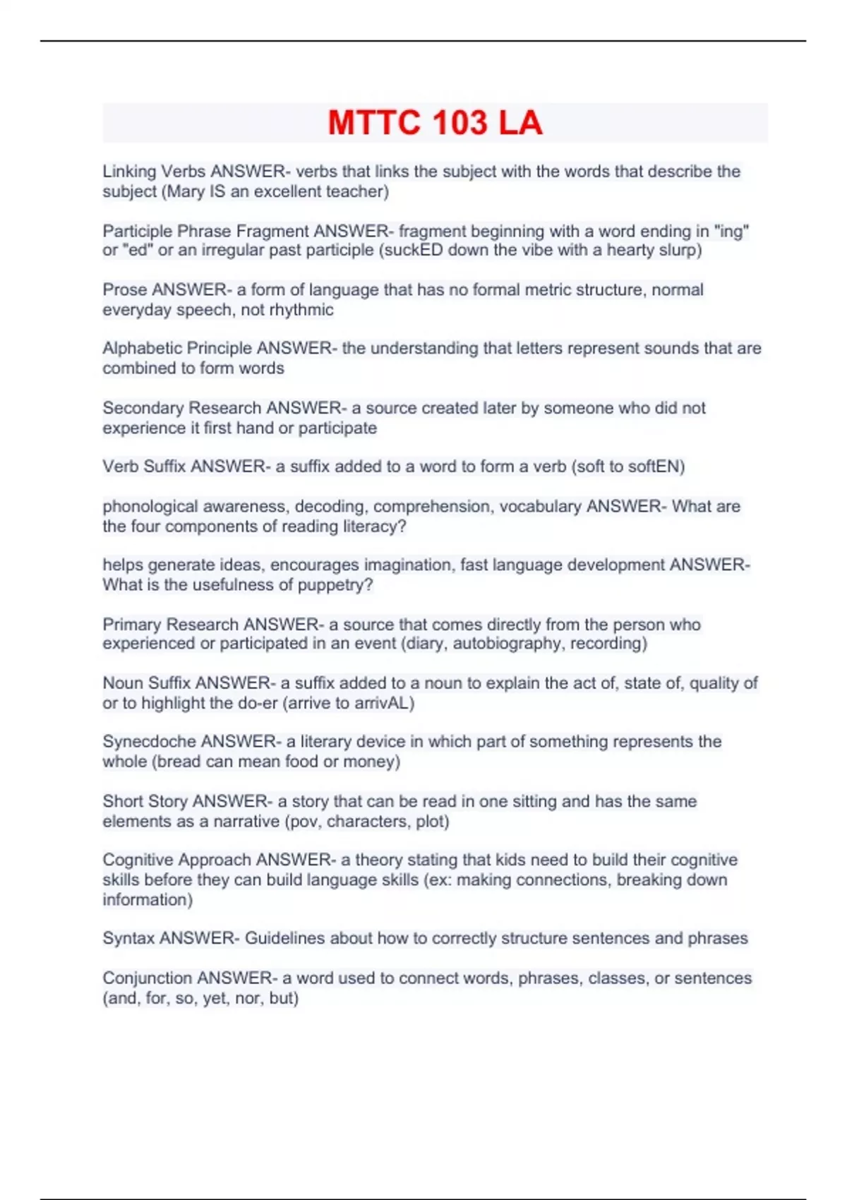 MTTC 103 LA Exam|Questions and answers 100% verified