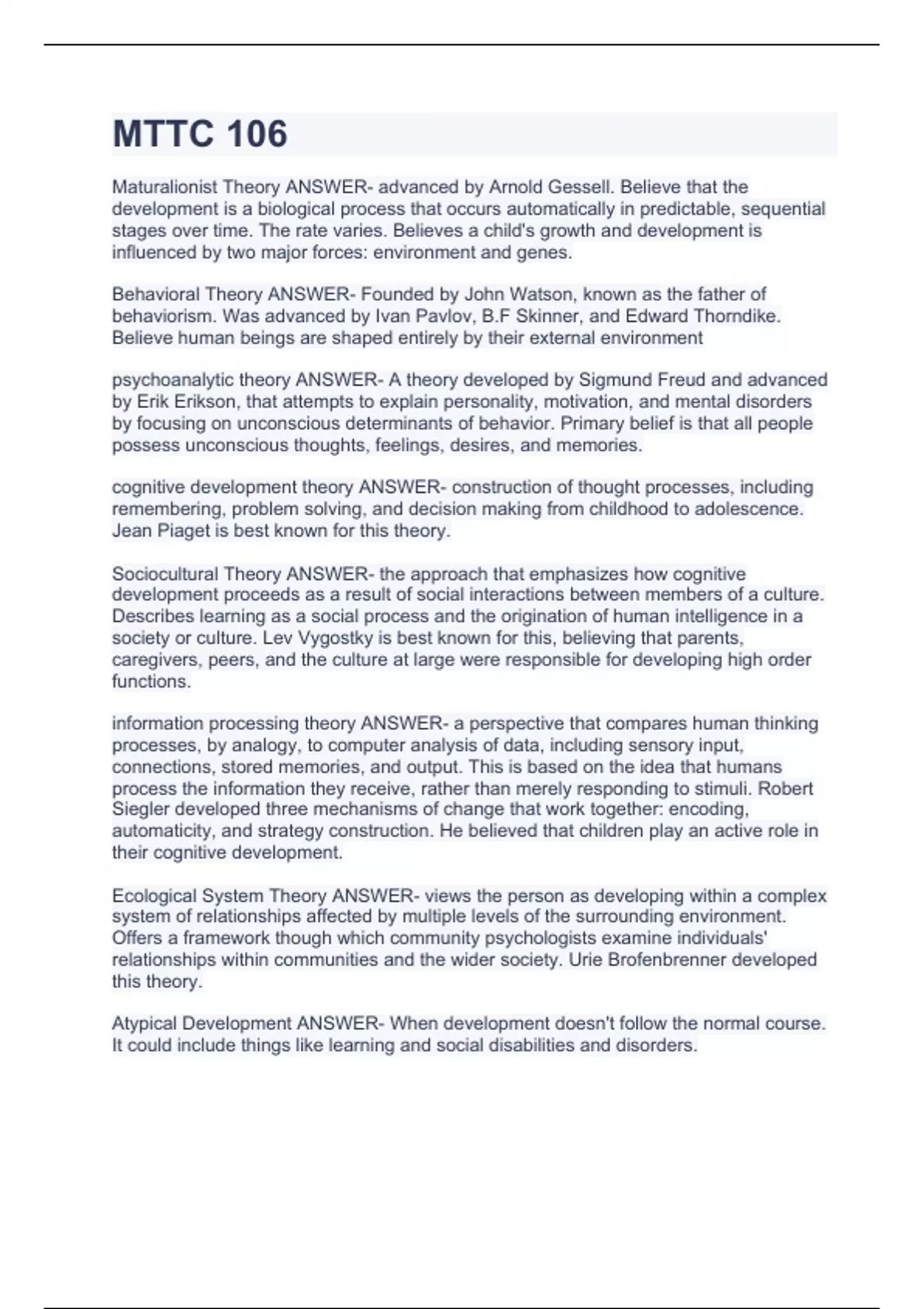 MTTC 106 Maturalionist Theory ANSWER- advanced by Arnold Gessell. Believe that the development is a biological process that occurs automatically in predictable, sequential stages over time. The rate varies. Believes a child's growth and development is influenced by two major forces: environment and genes. Behavioral Theory ANSWER- Founded by John Watson, known as the father of behaviorism. Was advanced by Ivan Pavlov, B.F Skinner, and Edward Thorndike. Believe human beings are shaped entirely by their external environment psychoanalytic theory ANSWER- A theory developed by Sigmund Freud and advanced by Erik Erikson, that attempts to explain personality, motivation, and mental disorders by focusing on unconscious determinants of behavior. Primary belief is that all people possess unconscious thoughts, feelings, desires, and memories. cognitive development theory ANSWER- construction of thought processes, including remembering, problem solving, and decision making from childhood to adolescence. Jean Piaget is best known for this theory. Sociocultural Theory ANSWER- the approach that emphasizes how cognitive development proceeds as a result of social interactions between members of a culture. Describes learning as a social process and the origination of human intelligence in a society or culture. Lev Vygostky is best known for this, believing that parents, caregivers, peers, and the culture at large were responsible for developing high order functions. information processing theory ANSWER- a perspective that compares human thinking processes, by analogy, to computer analysis of data, including sensory input, connections, stored memories, and output. This is based on the idea that humans process the information they receive, rather than merely responding to stimuli. Robert Siegler developed three mechanisms of change that work together: encoding, automaticity, and strategy construction. He believed that children play an active role in their cognitive development. Ecological System Theory ANSWER- views the person as developing within a complex system of relationships affected by multiple levels of the surrounding environment. Offers a framework though which community psychologists examine individuals' relationships within communities and the wider society. Urie Brofenbrenner developed this theory. Atypical Development ANSWER- When development doesn't follow the normal course. It could include things like learning and social disabilities and disorders.