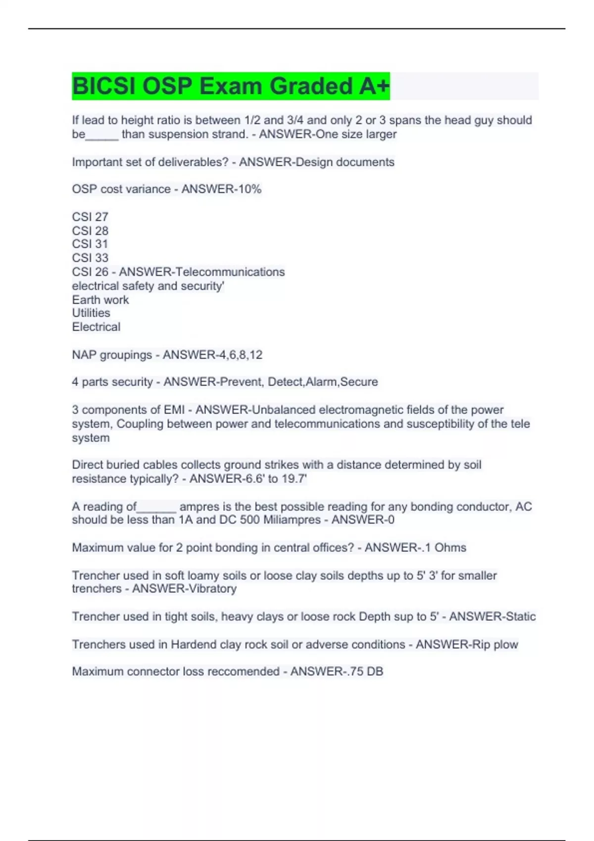 If lead to height ratio is between 1/2 and 3/4 and only 2 or 3 spans the head guy should be_____ than suspension strand. - ANSWER-One size larger Important set of deliverables? - ANSWER-Design documents OSP cost variance - ANSWER-10% CSI 27 CSI 28 CSI 31 CSI 33 CSI 26 - ANSWER-Telecommunications electrical safety and security' Earth work Utilities Electrical NAP groupings - ANSWER-4,6,8,12 4 parts security - ANSWER-Prevent, Detect,Alarm,Secure 3 components of EMI - ANSWER-Unbalanced electromagnetic fields of the power system, Coupling between power and telecommunications and susceptibility of the tele system Direct buried cables collects ground strikes with a distance determined by soil resistance typically? - ANSWER-6.6' to 19.7' A reading of______ ampres is the best possible reading for any bonding conductor, AC should be less than 1A and DC 500 Miliampres - ANSWER-0 Maximum value for 2 point bonding in central offices? - ANSWER-.1 Ohms Trencher used in soft loamy soils or loose clay soils depths up to 5' 3' for smaller trenchers - ANSWER-Vibratory Trencher used in tight soils, heavy clays or loose rock Depth sup to 5' - ANSWER-Static Trenchers used in Hardend clay rock soil or adverse conditions - ANSWER-Rip plow Maximum connector loss reccomended - ANSWER-.75 DB