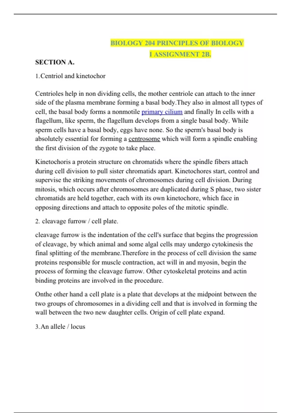 Summary BIOLOGY 204 PRINCIPLES OF BIOLOGY I ASSIGNMENT 2B.
