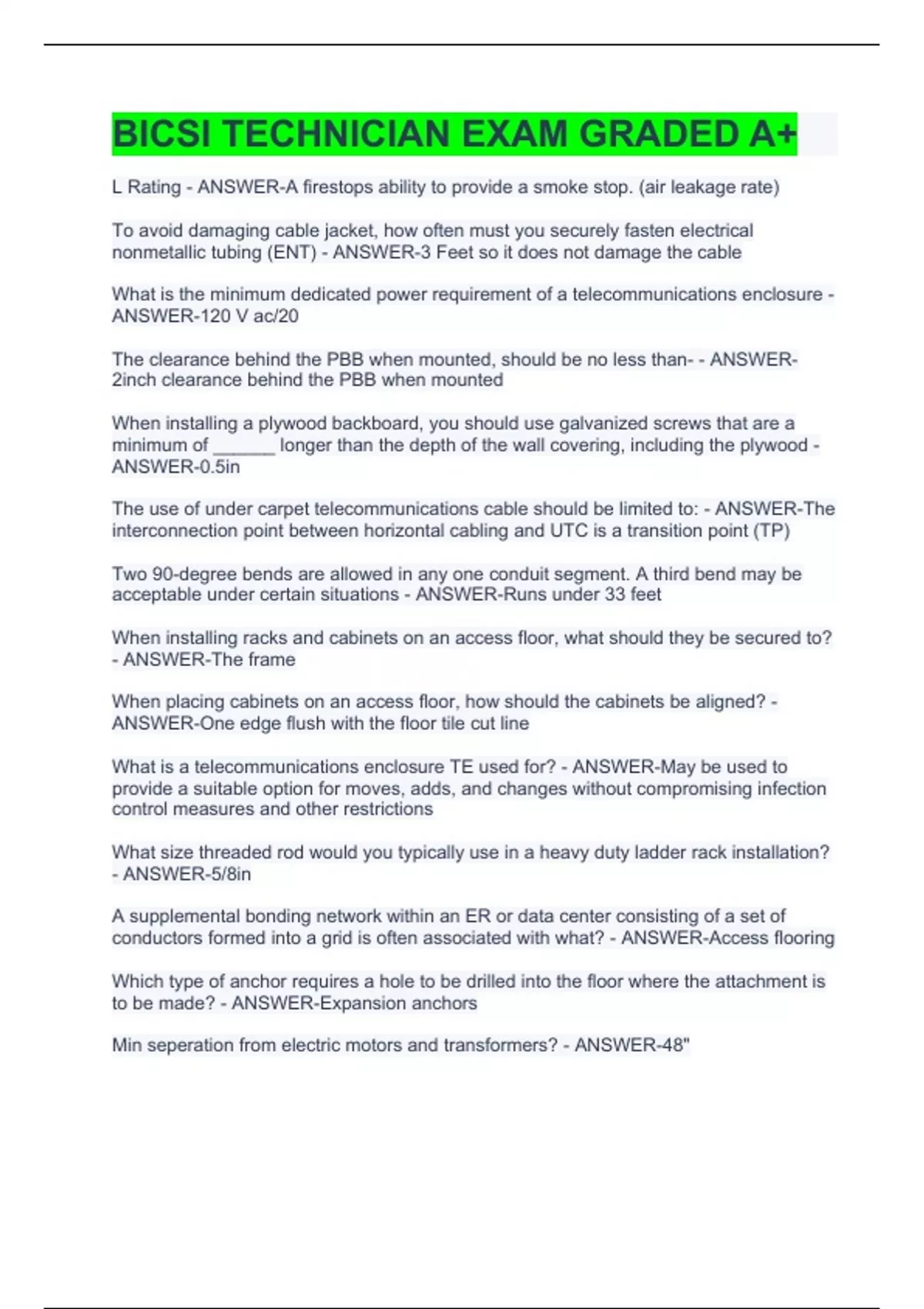BICSI TECHNICIAN EXAM GRADED A+