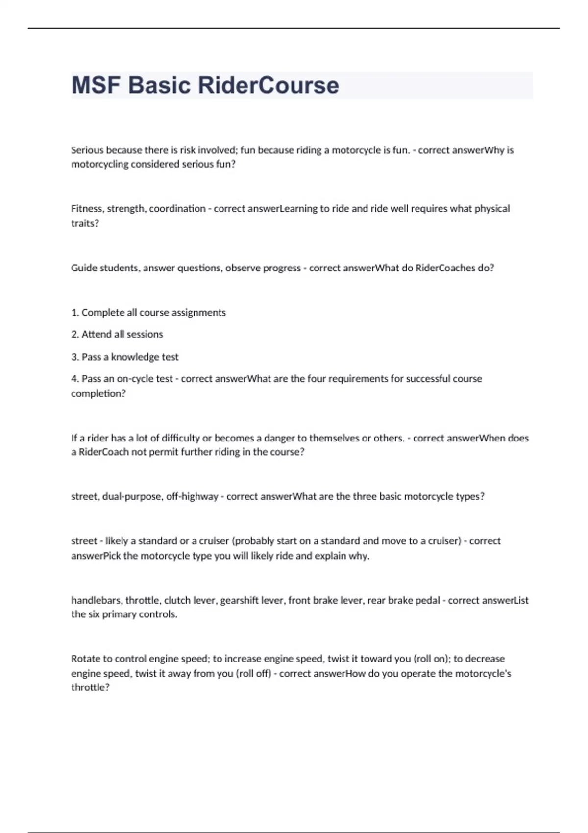 Serious because there is risk involved; fun because riding a motorcycle is fun. - correct answerWhy is motorcycling considered serious fun? Fitness, strength, coordination - correct answerLearning to ride and ride well requires what physical traits? Guide students, answer questions, observe progress - correct answerWhat do RiderCoaches do? 1. Complete all course assignments 2. Attend all sessions 3. Pass a knowledge test 4. Pass an on-cycle test - correct answerWhat are the four requirements for successful course completion? If a rider has a lot of difficulty or becomes a danger to themselves or others. - correct answerWhen does a RiderCoach not permit further riding in the course? street, dual-purpose, off-highway - correct answerWhat are the three basic motorcycle types? street - likely a standard or a cruiser (probably start on a standard and move to a cruiser) - correct answerPick the motorcycle type you will likely ride and explain why. handlebars, throttle, clutch lever, gearshift lever, front brake lever, rear brake pedal - correct answerList the six primary controls. Rotate to control engine speed; to increase engine speed, twist it toward you (roll on); to decrease engine speed, t