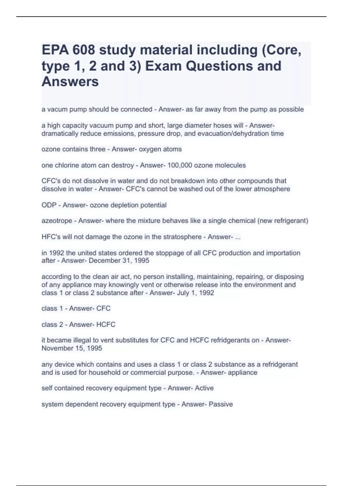EPA 608 study material including (Core, type 1, 2 and 3) Exam Questions and Answers