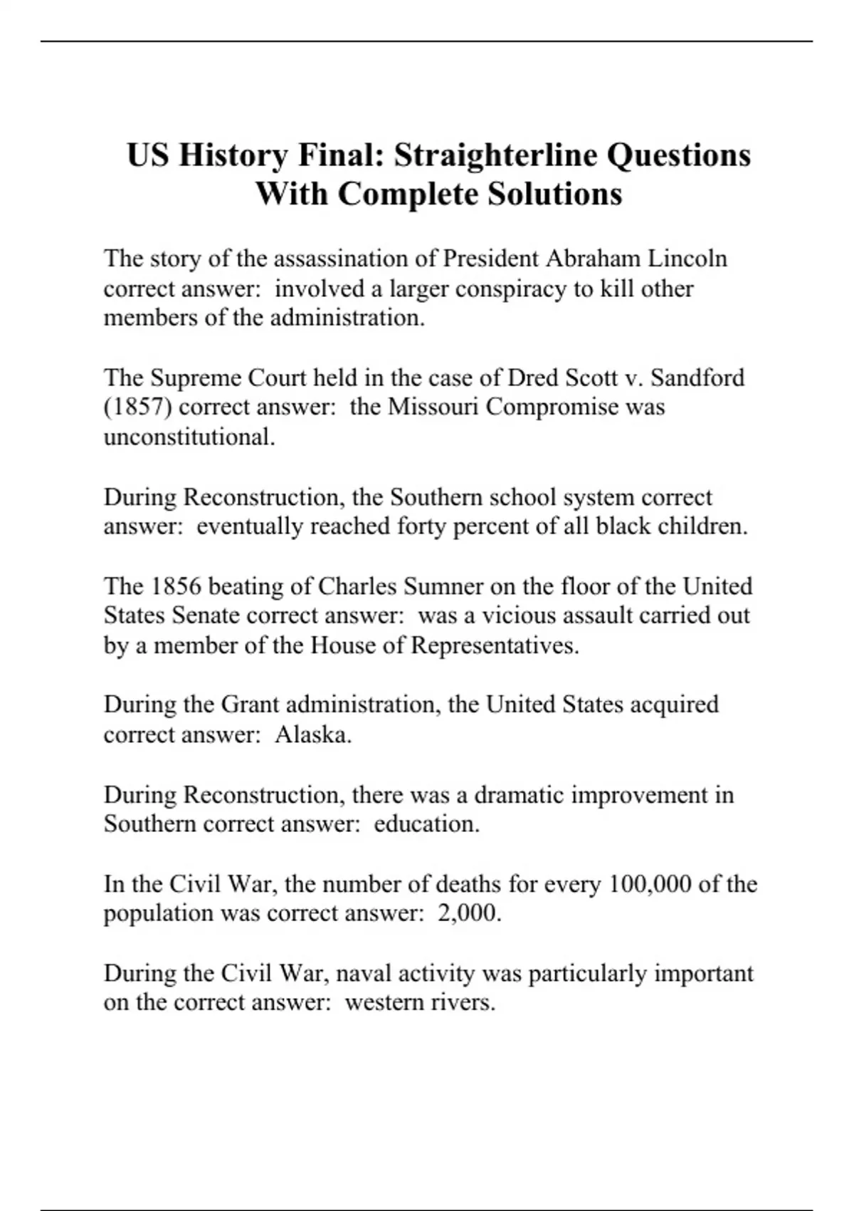 The story of the assassination of President Abraham Lincoln correct answer: involved a larger conspiracy to kill other members of the administration. The Supreme Court held in the case of Dred Scott v. Sandford (1857) correct answer: the Missouri Compromise was unconstitutional. During Reconstruction, the Southern school system correct answer: eventually reached forty percent of all black children. The 1856 beating of Charles Sumner on the floor of the United States Senate correct answer: was a vicious assault carried out by a member of the House of Representatives. During the Grant administration, the United States acquired correct answer: Alaska. During Reconstruction, there was a dramatic improvement in Southern correct answer: education. In the Civil War, the number of deaths for every 100,000 of the population was correct answer: 2,000. During the Civil War, naval activity was particularly important on the correct answer: western rivers. In the Battle of Gettysburg, in order to reach dug-in Union forces, General George Pickett's division had to cross correct answer: an open field. On April 14, 1861, Fort Sumter surrendered after correct answer: Confederate forces bombarded it. Which of the following statements about George B. McClellan is FALSE? correct answer: He originally served as commander of the Army of Northern Virginia. The Confederate States of America was formed correct answer: before Abraham Lincoln was inaugurated president. During Reconstruction, most "carpetbaggers" were correct answer: Northern white veterans who moved to the South.