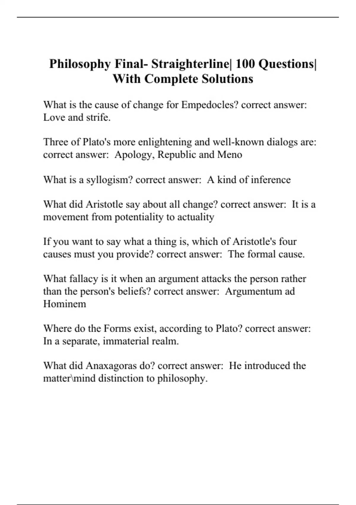 Philosophy Final- Straighterline| 100 Questions| With Complete Solutions