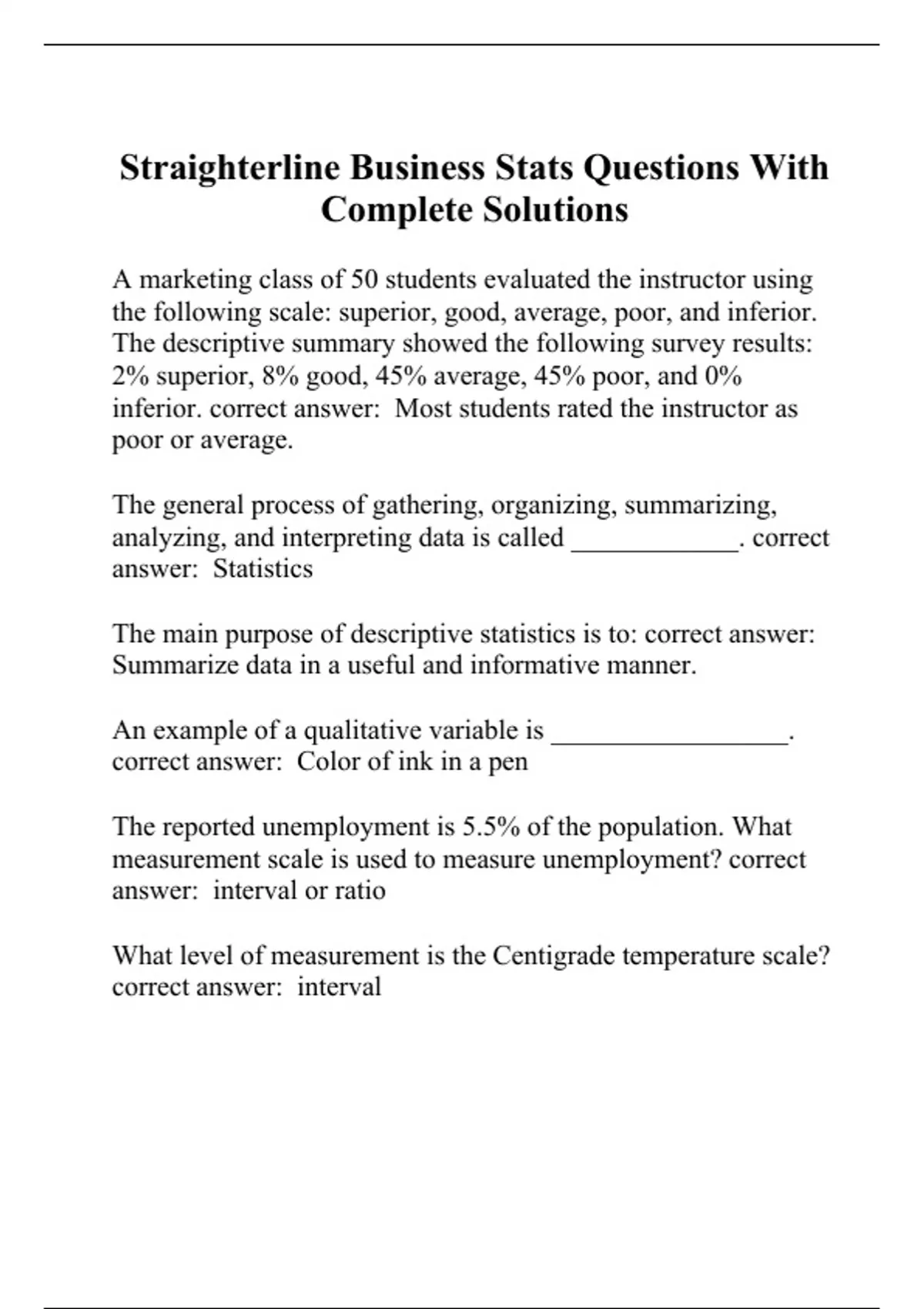 Straighterline Business Stats Questions With Complete Solutions.