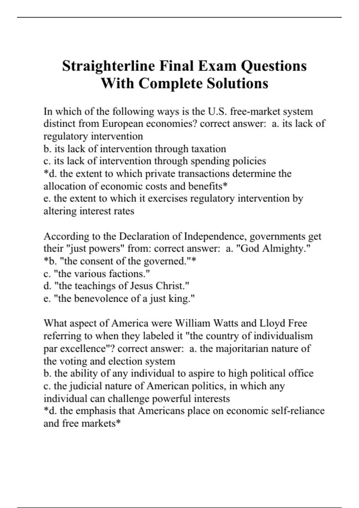 In which of the following ways is the U.S. free-market system distinct from European economies? correct answer: a. its lack of regulatory intervention b. its lack of intervention through taxation c. its lack of intervention through spending policies *d. the extent to which private transactions determine the allocation of economic costs and benefits* e. the extent to which it exercises regulatory intervention by altering interest rates According to the Declaration of Independence, governments get their "just powers" from: correct answer: a. "God Almighty." *b. "the consent of the governed."* c. "the various factions." d. "the teachings of Jesus Christ." e. "the benevolence of a just king." What aspect of America were William Watts and Lloyd Free referring to when they labeled it "the country of individualism par excellence"? correct answer: a. the majoritarian nature of the voting and election system b. the ability of any individual to aspire to high political office c. the judicial nature of American politics, in which any individual can challenge powerful interests *d. the emphasis that Americans place on economic self-reliance and free markets* e. the ability of the individual to join in labor unions and interest groups to pursue his or her political and financial self-interests French philosopher Michel Foucault referred to politics as:"________." correct answer: a. like making sausage b. the burden of citizens c. a means to an end *d. war by other means* e. a necessary evil What new policy was established by the U.S. Supreme Court's landmark Gideon v. Wainwright ruling? correct answer: a. the right to trial by jury b. the need to charge an arrested suspect with a specific crime within 24 hours of arrest c. the requirement that police read a suspect his rights before or during arrest *d. government provision of free legal counsel to the accused if they are too poor to hire a lawyer.* e. the practice of allowing a suspect out on bail until the time of the trial