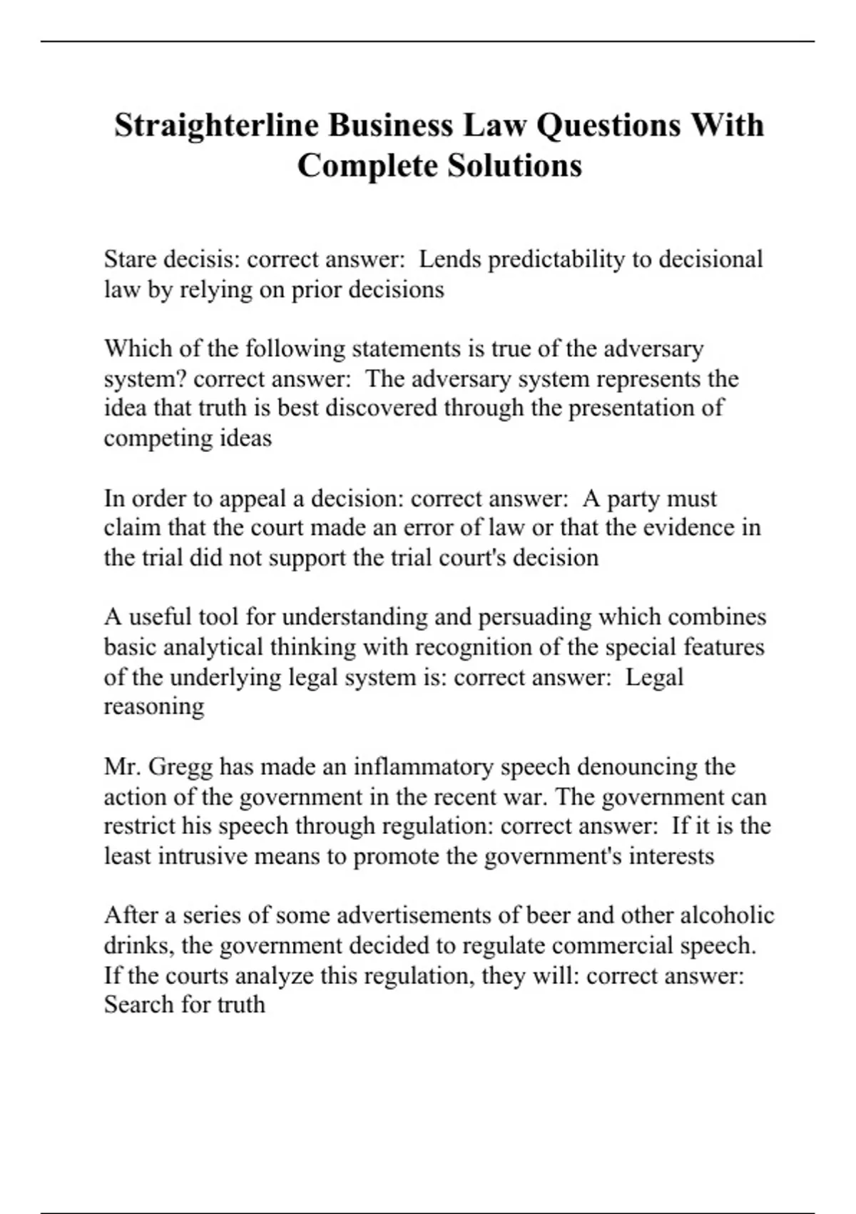 Stare decisis: correct answer: Lends predictability to decisional law by relying on prior decisions Which of the following statements is true of the adversary system? correct answer: The adversary system represents the idea that truth is best discovered through the presentation of competing ideas In order to appeal a decision: correct answer: A party must claim that the court made an error of law or that the evidence in the trial did not support the trial court's decision A useful tool for understanding and persuading which combines basic analytical thinking with recognition of the special features of the underlying legal system is: correct answer: Legal reasoning Mr. Gregg has made an inflammatory speech denouncing the action of the government in the recent war. The government can restrict his speech through regulation: correct answer: If it is the least intrusive means to promote the government's interests After a series of some advertisements of beer and other alcoholic drinks, the government decided to regulate commercial speech. If the courts analyze this regulation, they will: correct answer: Search for truth A van from Mario's Squibb Company is damaged by a heavy metal keg, which rolls out of the second floor window of the two storied Toss-Co. Flower building. Toss-Co. Flower is the sole occupant of the building. Although the van was parked under the window while making a delivery at the Toss Co. receiving dock, no one admits to having seen the keg fall, nor are there any witnesses who can state where the keg was just before the accident. Can Mario recover against Toss-Co. for negligence? correct answer: Mario can shift the burden of proof onto Toss-Co. to show that the accident was not caused by its (Toss-Co.'s) negligence if Mario can prove that kegs do not fall out of windows in the absence of negligence and that Toss-Co. had exclusive control of the keg prior to the acciden