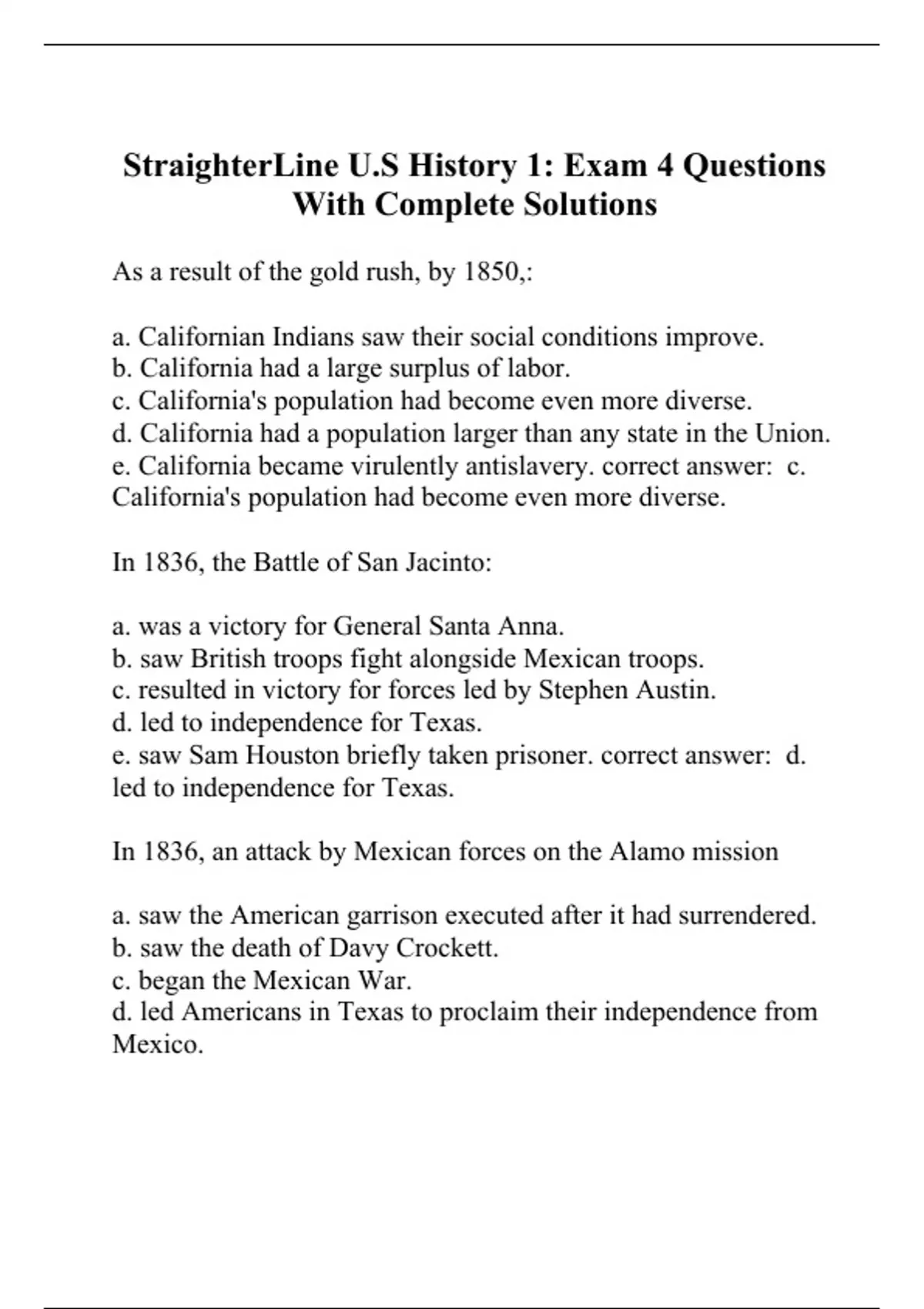 As a result of the gold rush, by 1850,: a. Californian Indians saw their social conditions improve. b. California had a large surplus of labor. c. California's population had become even more diverse. d. California had a population larger than any state in the Union. e. California became virulently antislavery. correct answer: c. California's population had become even more diverse. In 1836, the Battle of San Jacinto: a. was a victory for General Santa Anna. b. saw British troops fight alongside Mexican troops. c. resulted in victory for forces led by Stephen Austin. d. led to independence for Texas. e. saw Sam Houston briefly taken prisoner. correct answer: d. led to independence for Texas. In 1836, an attack by Mexican forces on the Alamo mission a. saw the American garrison executed after it had surrendered. b. saw the death of Davy Crockett. c. began the Mexican War. d. led Americans in Texas to proclaim their independence from Mexico. e. was a surprising victory for American forces in Texas correct answer: b. saw the death of Davy Crockett. Which of the following towns served as a major departure point for migrants traveling west on the overland trails?: a. Independence, Missouri b. Cedar Rapids, Iowa c. Ames, Iowa d. St. Louis, Missouri e. Kansas City, Missouri correct answer: a. Independence, Missouri In the 1820s and 1830s, the government of Mexico: a. consistently opposed American immigration into Texas. b. consistently favored American immigration into Texas. c. remained noncommittal about American immigration into Texas. d. moved from opposing to favoring American immigration into Texas. e. moved from favoring to opposing American immigration into Texas. correct answer: e. moved from favoring to opposing American immigration into Texas. Under the terms of the Treaty of Guadalupe Hidalgo, the United States: a. officially acquired only Texas. b. gave up rights to California (for a time) in exchange for New