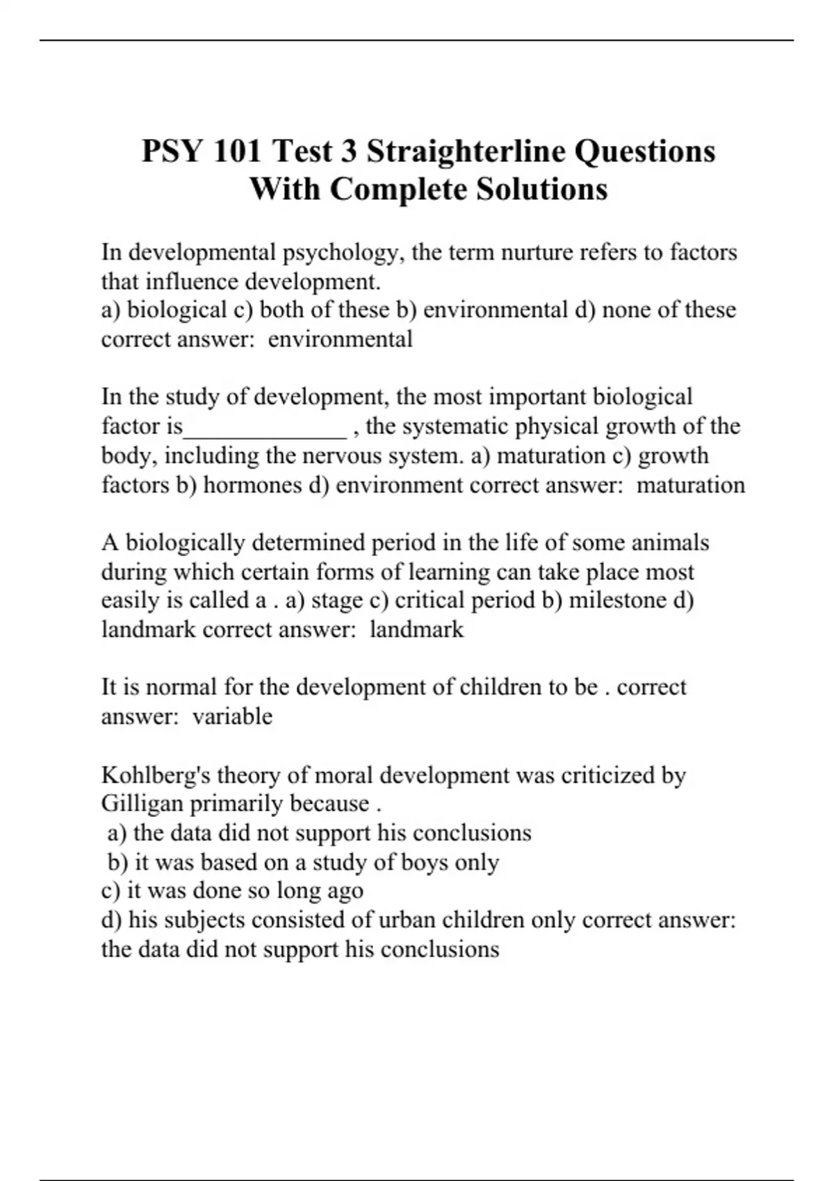 In developmental psychology, the term nurture refers to factors that influence development. a) biological c) both of these b) environmental d) none of these correct answer: environmental In the study of development, the most important biological factor is_____________ , the systematic physical growth of the body, including the nervous system. a) maturation c) growth factors b) hormones d) environment correct answer: maturation A biologically determined period in the life of some animals during which certain forms of learning can take place most easily is called a . a) stage c) critical period b) milestone d) landmark correct answer: landmark It is normal for the development of children to be . correct answer: variable Kohlberg's theory of moral development was criticized by Gilligan primarily because . a) the data did not support his conclusions b) it was based on a study of boys only c) it was done so long ago d) his subjects consisted of urban children only correct answer: the data did not support his conclusions Gilligan suggests that moral reasoning in centers on the needs of people rather than on abstractions. a) males c) both males and females b) females correct answer: females In Erikson's stage theory of personality development, the stages are turning points, or , the outcome of which will partly determine the course of future personality development. correct answer: crises Although an infant during the (first two weeks of life) is weak and dependent on adults, it does have useful reflexive behaviors and has already begun to learn. a) trimester c) toddler period b) neonatal period d) prenatal period correct answer: prenatal period