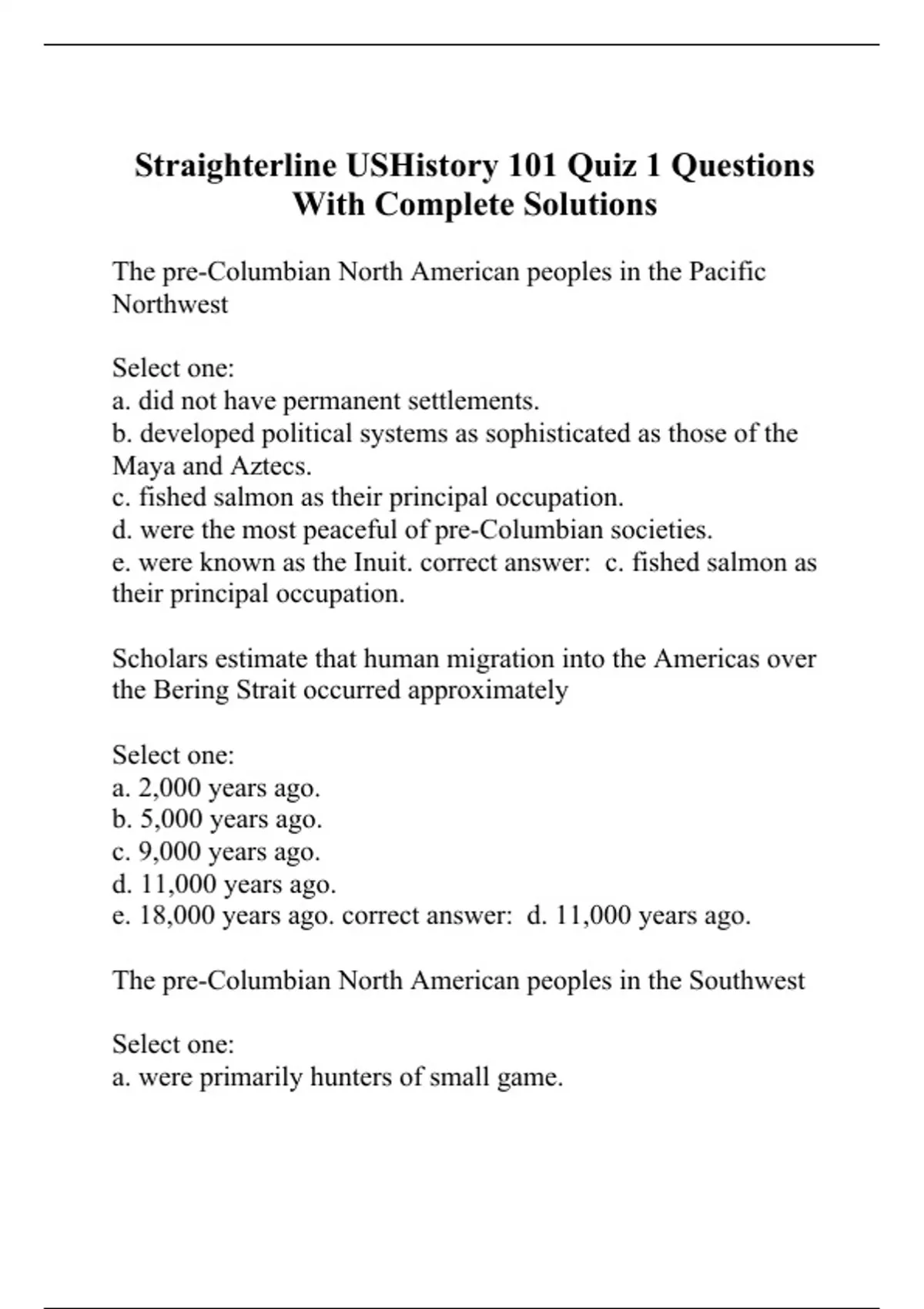 The pre-Columbian North American peoples in the Pacific Northwest Select one: a. did not have permanent settlements. b. developed political systems as sophisticated as those of the Maya and Aztecs. c. fished salmon as their principal occupation. d. were the most peaceful of pre-Columbian societies. e. were known as the Inuit. correct answer: c. fished salmon as their principal occupation. Scholars estimate that human migration into the Americas over the Bering Strait occurred approximately Select one: a. 2,000 years ago. b. 5,000 years ago. c. 9,000 years ago. d. 11,000 years ago. e. 18,000 years ago. correct answer: d. 11,000 years ago. The pre-Columbian North American peoples in the Southwest Select one: a. were primarily hunters of small game. b. built large irrigation systems for farming. c. lived in small, nomadic tribes. d. created an economy exclusively based on trade. e. primarily pursued moose and caribou for sustenance. correct answer: b. built large irrigation systems for farming. The origins of the majority of human existence in North America began Select one: a. with migrations across an ancient land bridge over the Bering Strait. b. with the explorations of Christopher Columbus. c. as a result of the development of the wheel. d. long after the last ice age ended. e. from the southern tip of South America. correct answer: a. with migrations across an ancient land bridge over the Bering Strait.