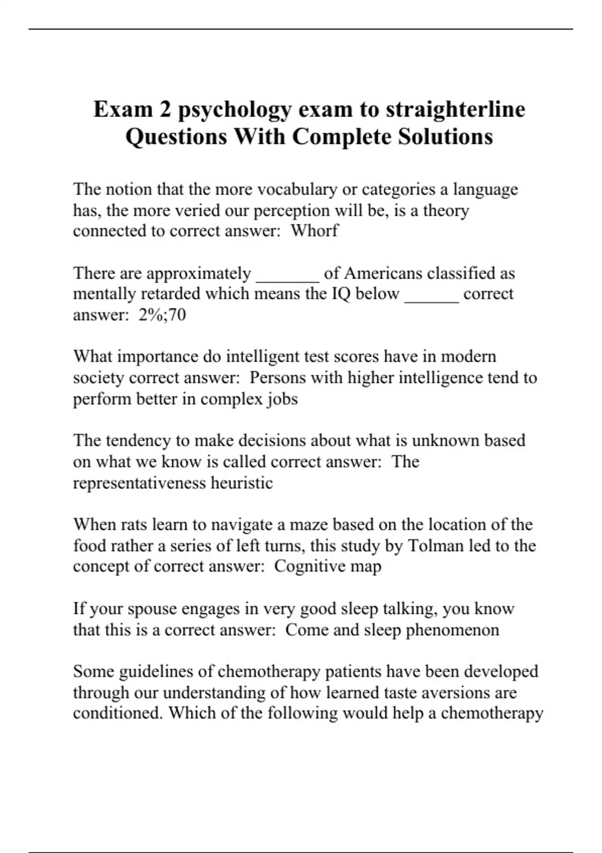 The notion that the more vocabulary or categories a language has, the more veried our perception will be, is a theory connected to correct answer: Whorf There are approximately _______ of Americans classified as mentally retarded which means the IQ below ______ correct answer: 2%;70 What importance do intelligent test scores have in modern society correct answer: Persons with higher intelligence tend to perform better in complex jobs The tendency to make decisions about what is unknown based on what we know is called correct answer: The representativeness heuristic When rats learn to navigate a maze based on the location of the food rather a series of left turns, this study by Tolman led to the concept of correct answer: Cognitive map If your spouse engages in very good sleep talking, you know that this is a correct answer: Come and sleep phenomenon Some guidelines of chemotherapy patients have been developed through our understanding of how learned taste aversions are conditioned. Which of the following would help a chemotherapy patient avoid a learned taste aversion correct answer: Fasting before a treatment and playing video games OK high school student taking the SAT on the East Coast are ready exact same instructions and given the exact same amount of time to complete the SAT and students on the West Coast. This feature of administering the same test in the same manner at different locations is known as correct answer: Standardization When asked what your parents phone number is you cannot repeat it but a moment later you can dilute from memory of that looking up. In this case which memory system has served you well correct answer: Procedural memory tranquilizer, sedatives and narcotics all belong to the category of_______ drugs correct answer: Depressant If you remember or 12 series NBCIBMCBSFBI in the form of three letter abbreviation for well-known organization you improve your ability to recall the series by means of correct answer: Chunking Kathy says that when she meditates, she feels like she becomes one with the universe. Kathy has experienced correct answer: An alternate state of consciousness The term used to describe a split in consciousness awareness that allows us to perform two or make tasks at the same time correct answer: Divided consciousness