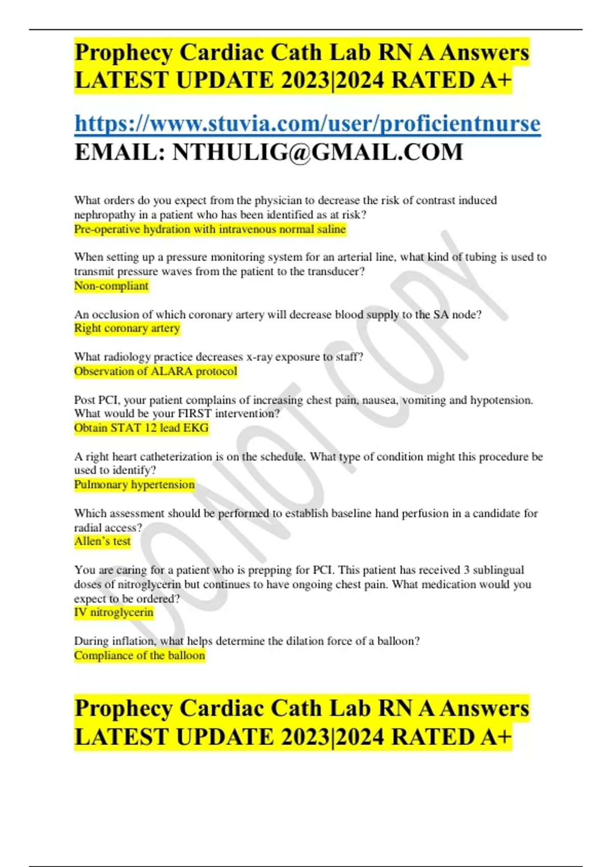 Prophecy Cardiac Cath Lab RN A Answers LATEST UPDATE 2023|2024 RATED A+ EMAIL: Prophecy Cardiac Cath Lab RN A Answers LATEST UPDATE 2023|2024 RATED A+ What orders do you expect from the physician to decrease the risk of contrast induced nephropathy in a patient who has been identified as at risk? Pre-operative hydration with intravenous normal saline When setting up a pressure monitoring system for an arterial line, what kind of tubing is used to transmit pressure waves from the patient to the transducer? Non-compliant An occlusion of which coronary artery will decrease blood supply to the SA node? Right coronary artery What radiology practice decreases x-ray exposure to staff? Observation of ALARA protocol Post PCI, your patient complains of increasing chest pain, nausea, vomiting and hypotension. What would be your FIRST intervention? Obtain STAT 12 lead EKG A right heart catheterization is on the schedule. What type of condition might this procedure be used to identify? Pulmonary hypertension Which assessment should be performed to establish baseline hand perfusion in a candidate for radial access? Allen’s test You are caring for a patient who is prepping for PCI. This patient has received 3 sublingual doses of nitroglycerin but continues to have ongoing chest pain. What medication would you expect to be ordered? IV nitroglycerin During inflation, what helps determine the dilation force of a balloon? Compliance of the balloon