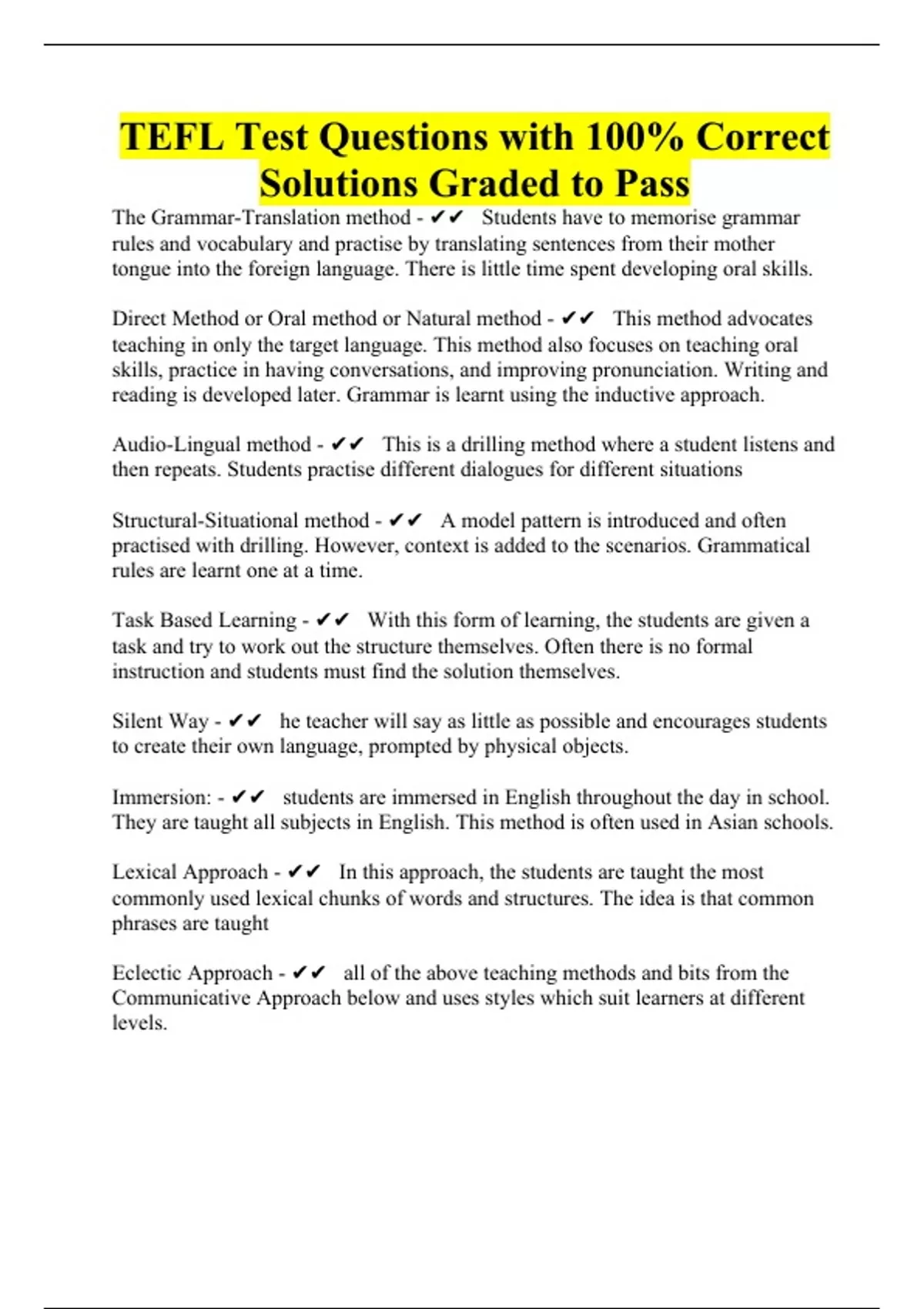 TEFL Test Questions with 100% Correct Solutions Graded to Pass