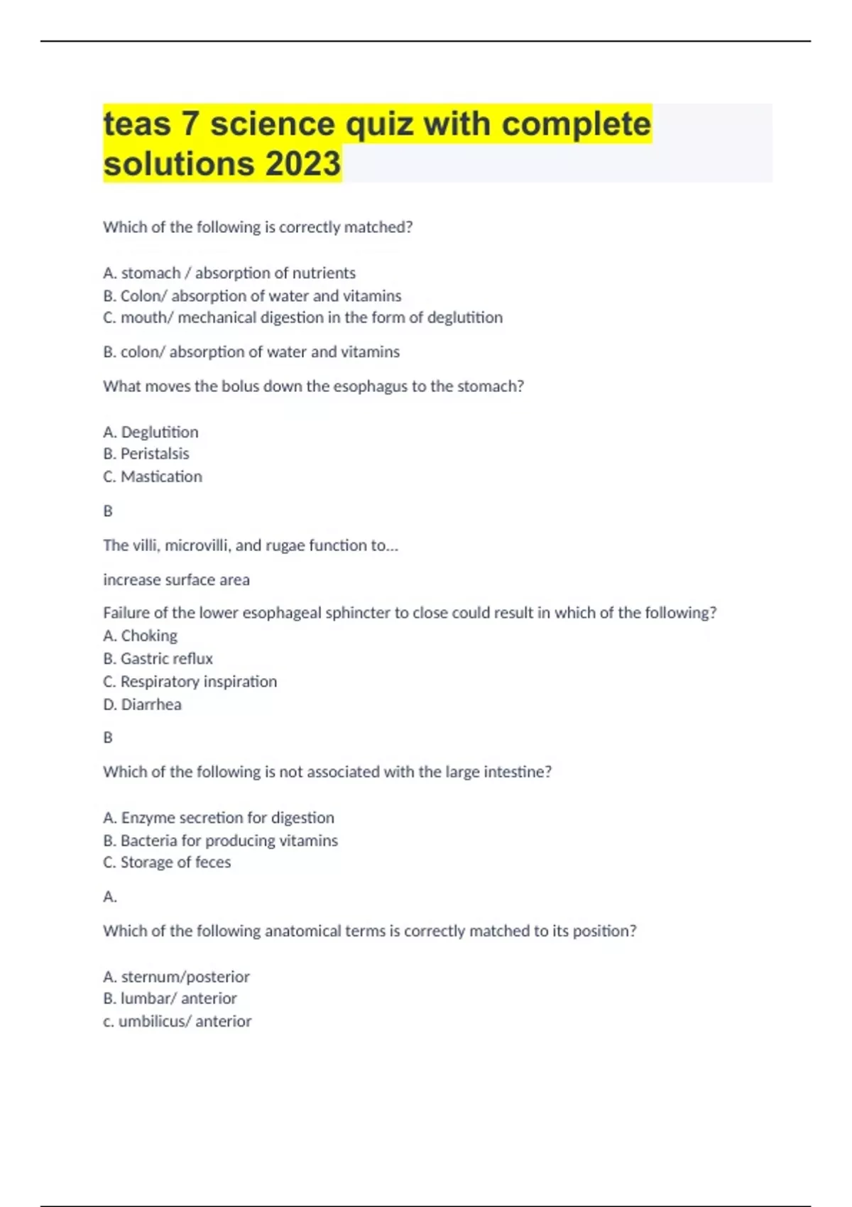 Which of the following is correctly matched? A. stomach / absorption of nutrients B. Colon/ absorption of water and vitamins C. mouth/ mechanical digestion in the form of deglutition B. colon/ absorption of water and vitamins What moves the bolus down the esophagus to the stomach? A. Deglutition B. Peristalsis C. Mastication B The villi, microvilli, and rugae function to... increase surface area Failure of the lower esophageal sphincter to close could result in which of the following? A. Choking B. Gastric reflux C. Respiratory inspiration D. Diarrhea B Which of the following is not associated with the large intestine? A. Enzyme secretion for digestion B. Bacteria for producing vitamins C. Storage of feces A. Which of the following anatomical terms is correctly matched to its position? A. sternum/posterior B. lumbar/ anterior c. umbilicus/ anterior C. Which of the following statements are true? (select all that apply) A. the brain is superficial to the skull B. the toes are anterior to the foot C. the skin is deep to the bones D. the brachium is proximal to the antebrachium B & D Which of the following is located on the anterior region of the human body? A. Patella B. Buttocks C. Scapula A Which of the following is the name for a nerve cell? A. Receptor B. Neuron C. Axon D. Dendrite B Which of the following describes a dendrite? A. it is coated by the myelin sheath B. it attaches to the axon C. it is a nerve fiber D. it releases neurotransmitters C Which of the following is not a function of the nervous system? A. it responds with muscular contractions and glandular secretions B. it senses internal and external changes C. it stores fat and metabolically responds C Typically, egg & sperm meet for fertilization in which of the following? A. Fallopian Tube B. Vagina C. Uterus D. Cervix A Male gametes are produced in the __________ and mature in the __________. testes/ epididymis Which of the following is correctly matched? A. Sebaceous gland/oil B. aporcine sweat glands/ the primary perspiration involved in evaporative cooling C. eccrine glands/ earwax A Which of the following structures in the male reproductive system secretes a fluid that nourishes and protects sperm? A. Urethra B. Prostate gland c. vas deferens d. epididymis B