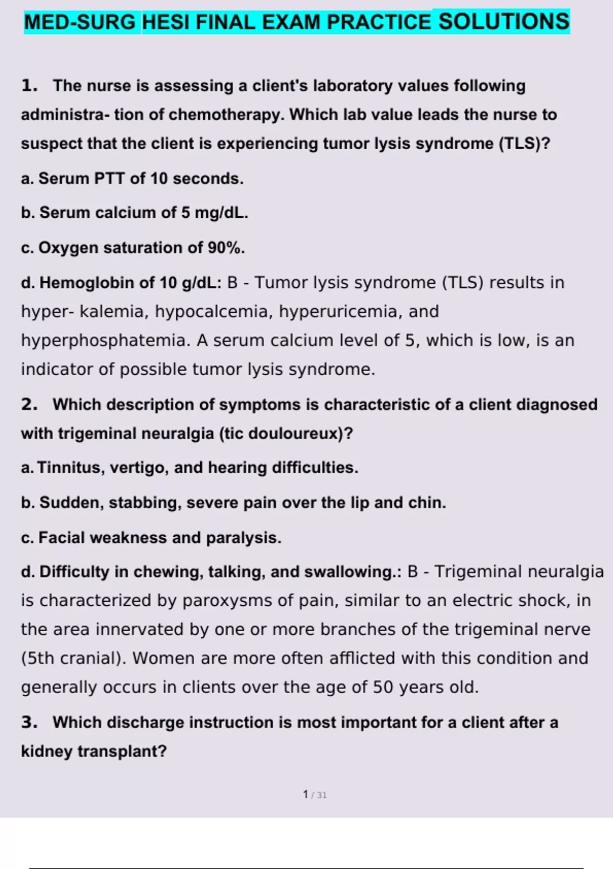MED-SURG HESI FINAL EXAM PRACTICE SOLUTIONS QUESTIONS AND ANSWERS A+ RATED