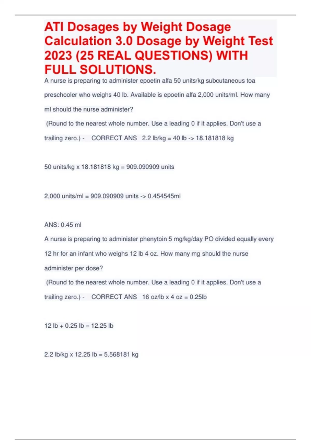 ATI Dosages by Weight Dosage Calculation 3.0 Dosage by Weight Test 2023 (25 REAL QUESTIONS) WITH FULL SOLUTIONS.