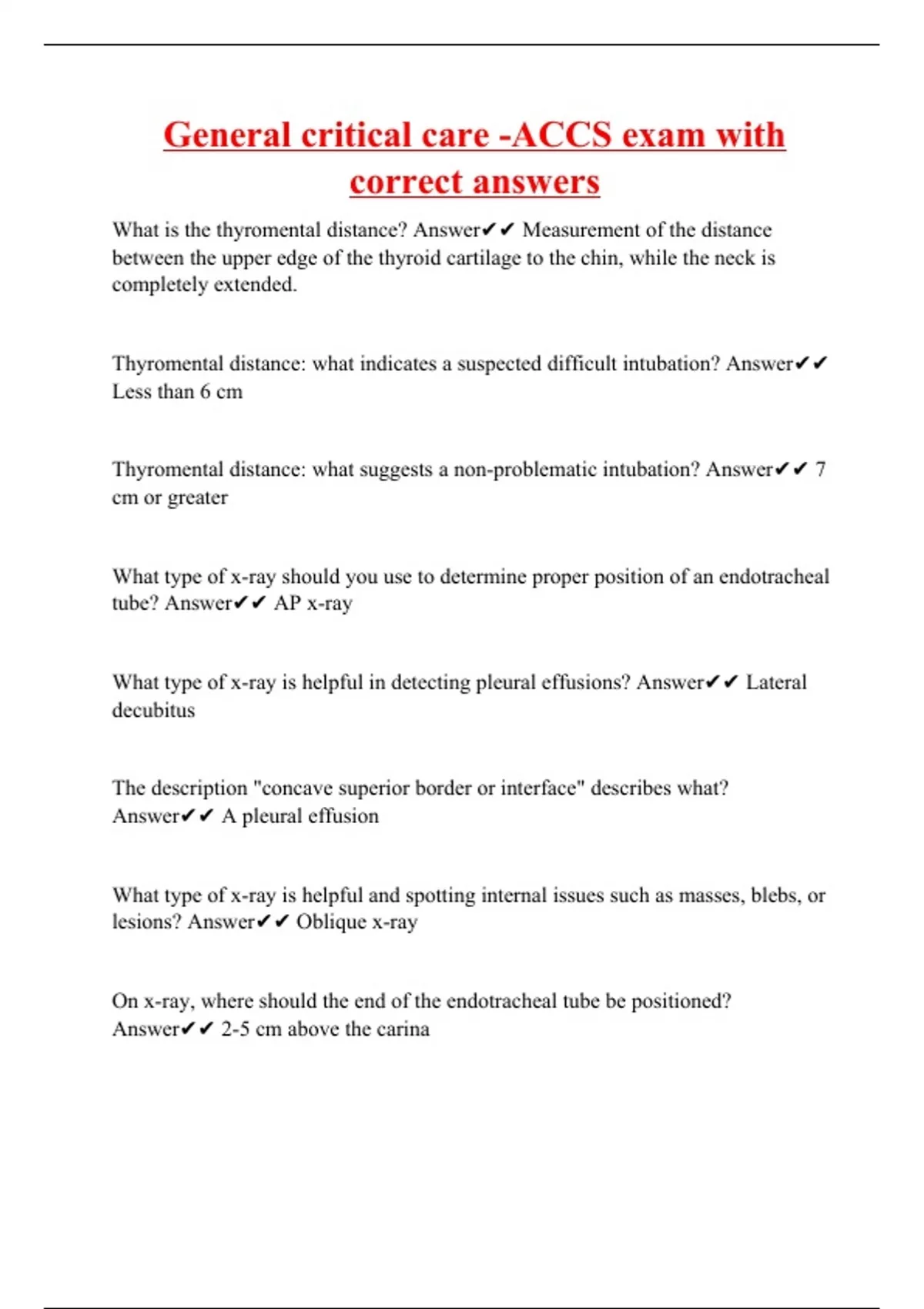 What is the thyromental distance? Answer Measurement of the distance between the upper edge of the thyroid cartilage to the chin, while the neck is completely extended. Thyromental distance: what indicates a suspected difficult intubation? Answer Less than 6 cm Thyromental distance: what suggests a non-problematic intubation? Answer 7 cm or greater What type of x-ray should you use to determine proper position of an endotracheal tube? Answer AP x-ray What type of x-ray is helpful in detecting pleural effusions? Answer Lateral decubitus The description "concave superior border or interface" describes what? Answer A pleural effusion What type of x-ray is helpful and spotting internal issues such as masses, blebs, or lesions? Answer Oblique x-ray On x-ray, where should the end of the endotracheal tube be positioned? Answer 2-5 cm above the carina