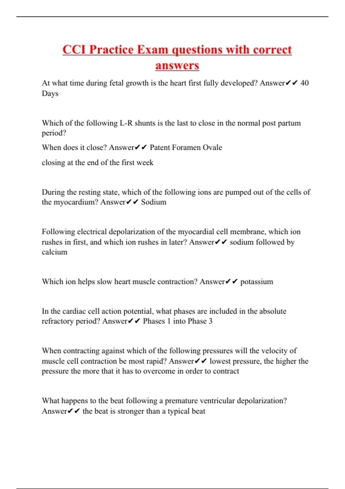 At what time during fetal growth is the heart first fully developed? Answer 40 Days Which of the following L-R shunts is the last to close in the normal post partum period? When does it close? Answer Patent Foramen Ovale closing at the end of the first week During the resting state, which of the following ions are pumped out of the cells of the myocardium? Answer Sodium Following electrical depolarization of the myocardial cell membrane, which ion rushes in first, and which ion rushes in later? Answer sodium followed by calcium Which ion helps slow heart muscle contraction? Answer potassium In the cardiac cell action potential, what phases are included in the absolute refractory period? Answer Phases 1 into Phase 3 When contracting against which of the following pressures will the velocity of muscle cell contraction be most rapid? Answer lowest pressure, the higher the pressure the more that it has to overcome in order to contract