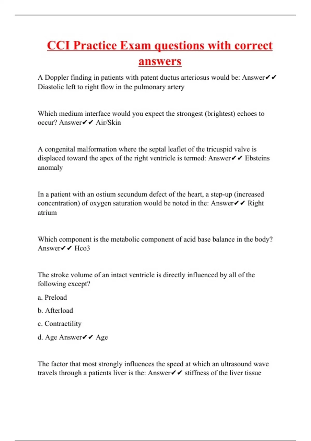 A Doppler finding in patients with patent ductus arteriosus would be: Answer Diastolic left to right flow in the pulmonary artery Which medium interface would you expect the strongest (brightest) echoes to occur? Answer Air/Skin A congenital malformation where the septal leaflet of the tricuspid valve is displaced toward the apex of the right ventricle is termed: Answer Ebsteins anomaly In a patient with an ostium secundum defect of the heart, a step-up (increased concentration) of oxygen saturation would be noted in the: Answer Right atrium Which component is the metabolic component of acid base balance in the body? Answer Hco3 The stroke volume of an intact ventricle is directly influenced by all of the following except? a. Preload b. Afterload c. Contractility d. Age Answer Age The factor that most strongly influences the spe