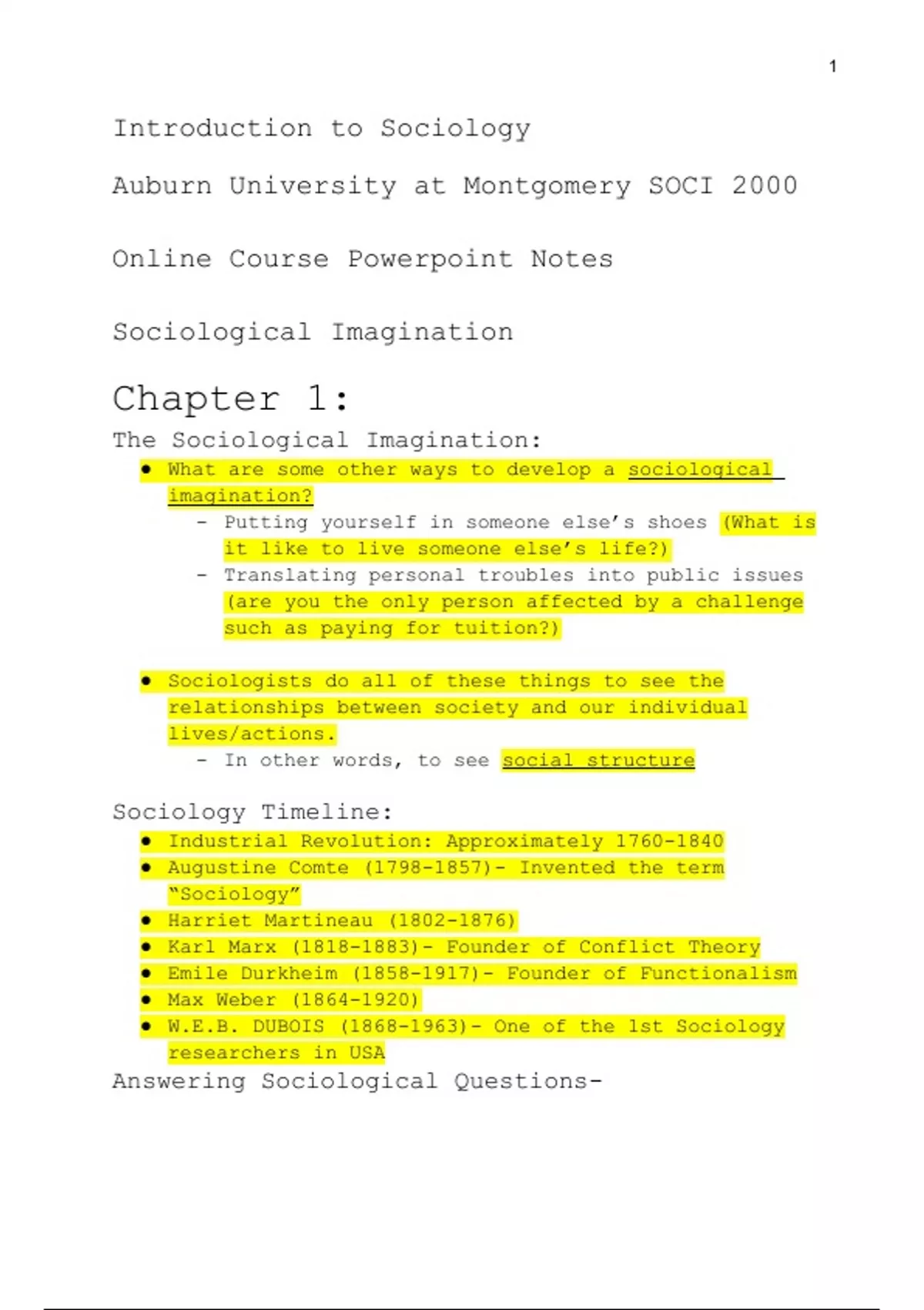 This document contains typed notes from a PowerPoint lecture in the online Introduction to Sociology course at Auburn University at Montgomery. These notes are from Chapter 1, the Sociological Imagination.