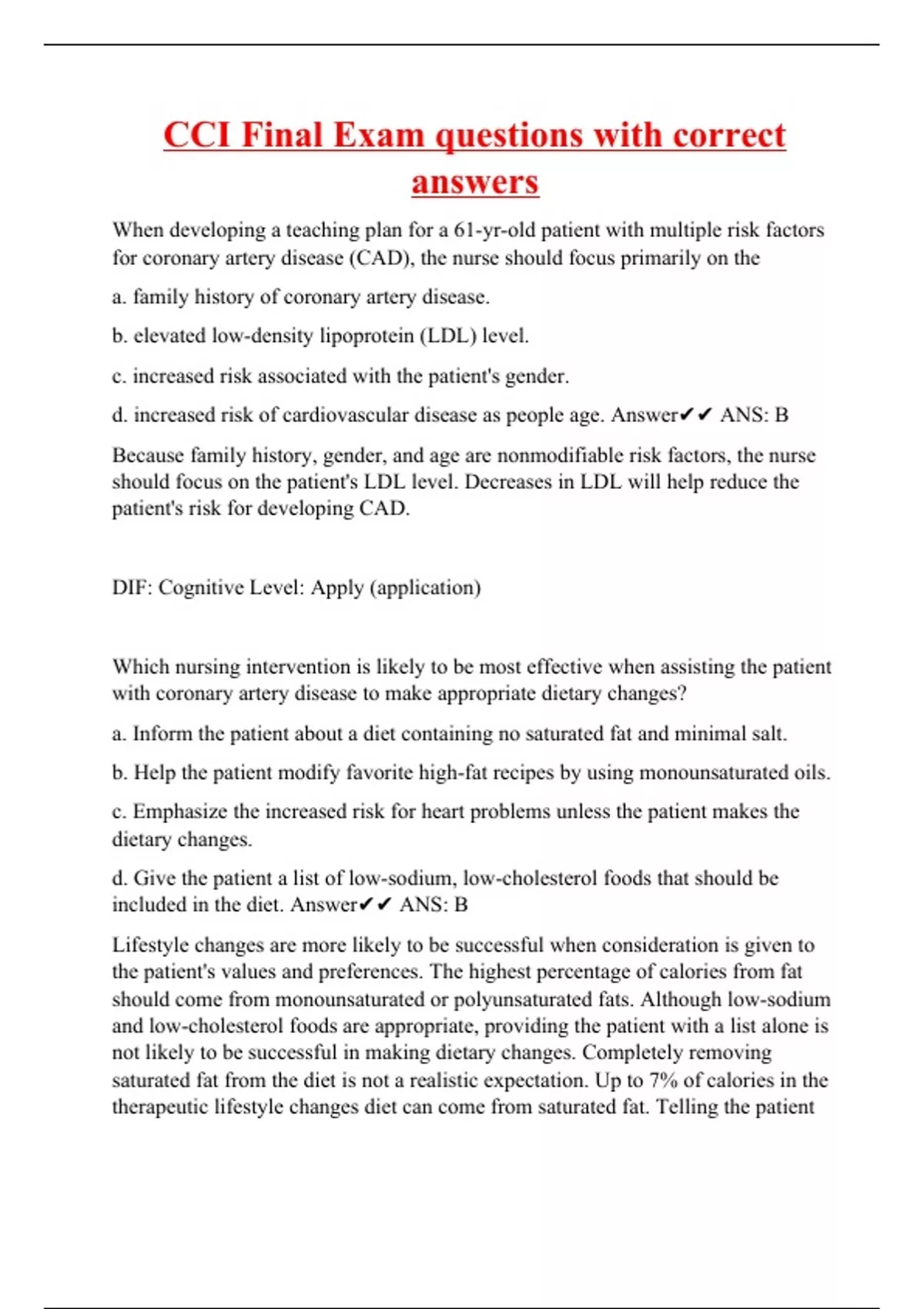 When developing a teaching plan for a 61-yr-old patient with multiple risk factors for coronary artery disease (CAD), the nurse should focus primarily on the a. family history of coronary artery disease. b. elevated low-density lipoprotein (LDL) level. c. increased risk associated with the patient's gender. d. increased risk of cardiovascular disease as people age. Answer ANS: B Because family history, gender, and age are nonmodifiable risk factors, the nurse should focus on the patient's LDL level. Decreases in LDL will help reduce the patient's risk for developing CAD. DIF: Cognitive Level: Apply (application) Which nursing intervention is likely to be most effective when assisting the patient with coronary artery disease to make appropriate dietary changes? a. Inform the patient about a diet containing no saturated fat and minimal salt. b. Help the patient modify favorite high-fat recipes by using monounsaturated oils. c. Emphasize the increased risk for heart problems unless the patient makes the dietary changes. d. Give the patient a list of low-sodium, low-cholesterol foods that should be included in the diet. Answer ANS: B Lifestyle changes are more likely to be successful when consideration is given to the patient's values and preferences. The highest percentage of calories from fat should come from monounsaturated or polyunsaturated fats. Although low-sodium and low-cholesterol foods are appropriate, providing the patient with a list alone is not likely to be successful in making dietary changes. Completely removing saturated fat from the diet is not a realistic expectation. Up to 7% of calories in the therapeutic lifestyle changes diet can come