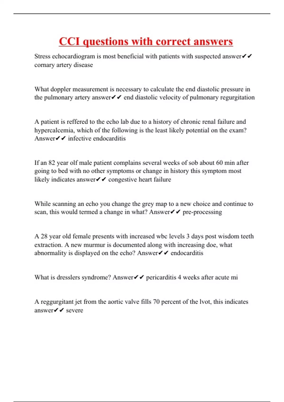 Stress echocardiogram is most beneficial with patients with suspected answer cornary artery disease What doppler measurement is necessary to calculate the end diastolic pressure in the pulmonary artery answer end diastolic velocity of pulmonary regurgitation A patient is reffered to the echo lab due to a history of chronic renal failure and hypercalcemia, which of the following is the least likely potential on the exam? Answer infective endocarditis If an 82 year olf male patient complains several weeks of sob about 60 min after going to bed with no other symptoms or change in history this symptom most likely indicates answer congestive heart failure While scanning an echo you change the grey map to a new choice and continue to scan, this would termed a change in what? Answer pre-processing A 28 year old female presents with increased wbc levels 3 days post wisdom teeth extraction. A new murmur is documented along with increasing doe, what abnormality is displayed on the echo? Answer endocarditis What is dresslers syndrome? Answer pe
