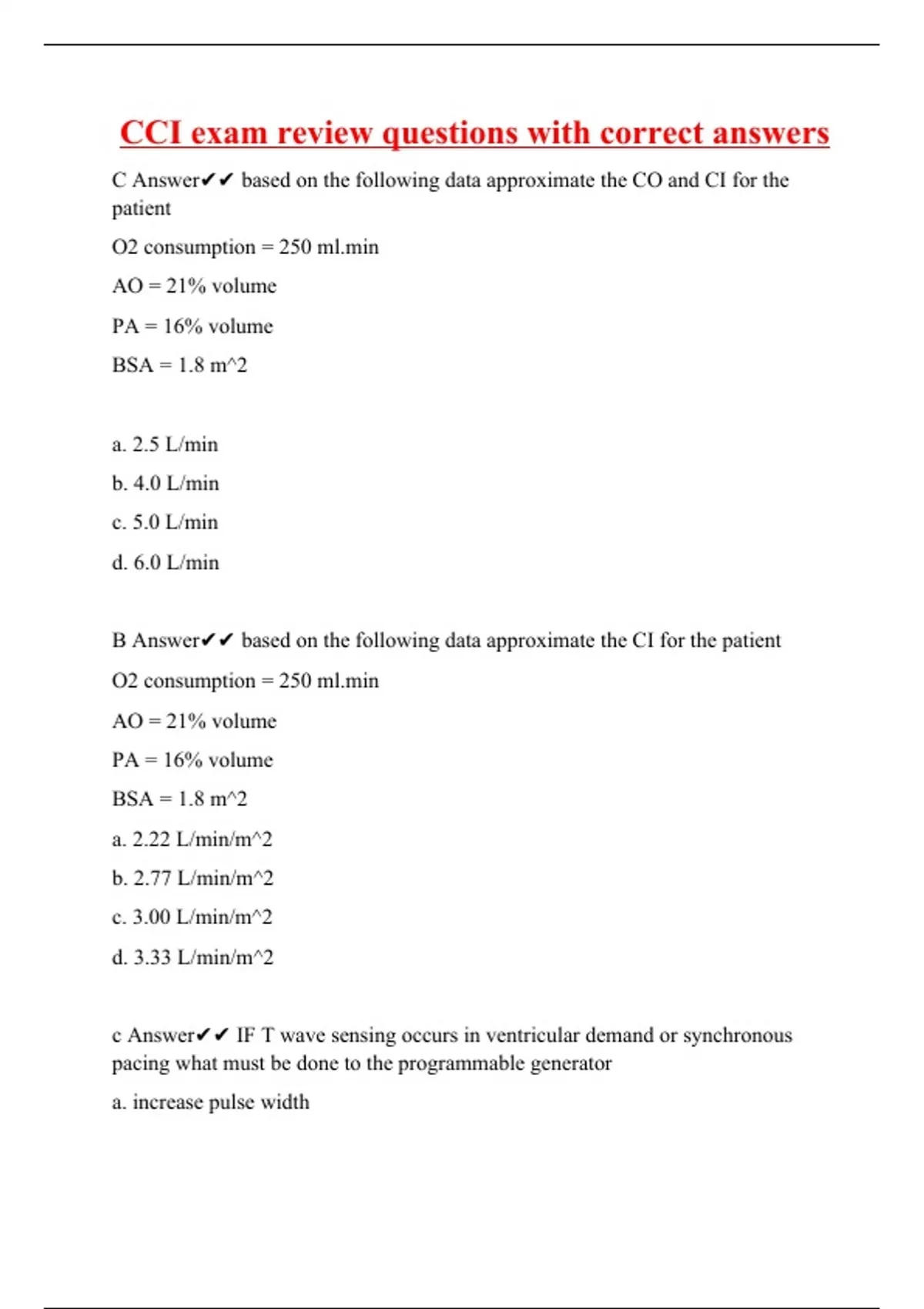 C Answer based on the following data approximate the CO and CI for the patient O2 consumption = 250 AO = 21% volume PA = 16% volume BSA = 1.8 m^2 a. 2.5 L/min b. 4.0 L/min c. 5.0 L/min d. 6.0 L/min B Answer based on the following data approximate the CI for the patient O2 consumption = 250 AO = 21% volume PA = 16% volume BSA = 1.8 m^2 a. 2.22 L/min/m^2 b. 2.77 L/min/m^2 c. 3.00 L/min/m^2 d. 3.33 L/min/m^2 c Answer IF T wave sensing occ