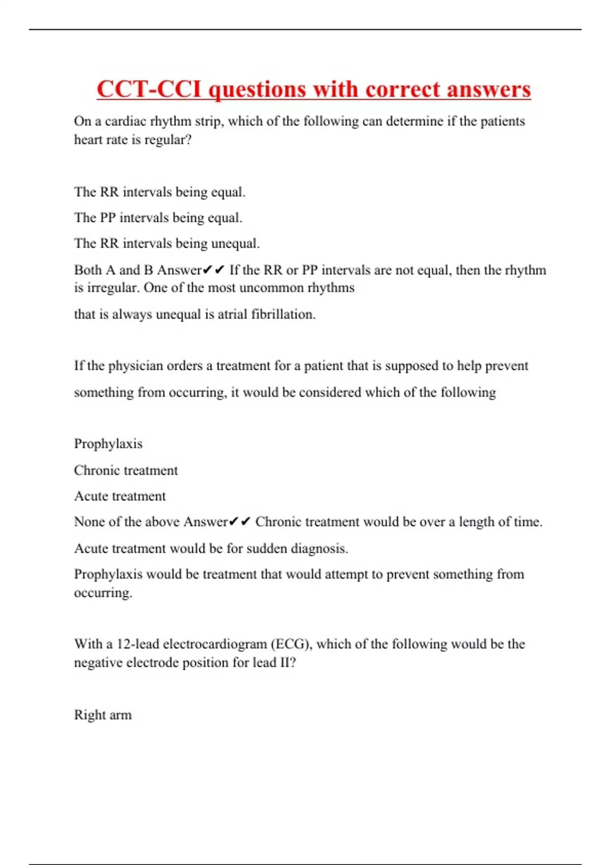 On a cardiac rhythm strip, which of the following can determine if the patients heart rate is regular? The RR intervals being equal. The PP intervals being equal. The RR intervals being unequal. Both A and B Answer If the RR or PP intervals are not equal, then the rhythm is irregular. One of the most uncommon rhythms that is always unequal is atrial fibrillation. If the physician orders a treatment for a patient that is supposed to help prevent something from occurring, it would be considered which of the following Prophylaxis Chronic treatment Acute treatment None of the above Answer Chronic treatment would be over a length of time. Acute treatment would be for sudden diagnosis. Prophylaxis would be treatment that would attempt to prevent something from occurring. With a 12-lead electrocardiogram (ECG), which of the following would be the negative electrode position for lead II? Right arm