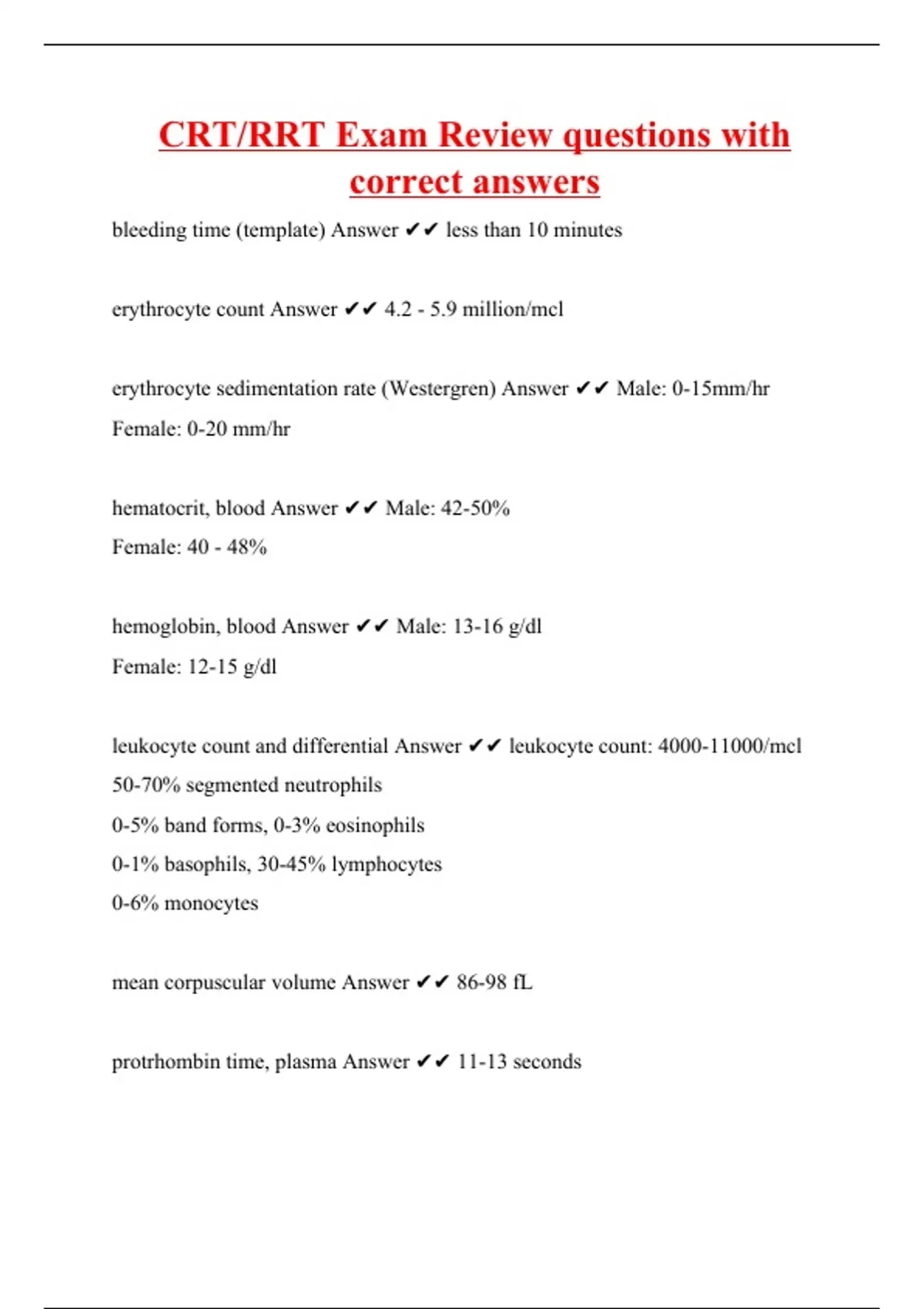 bleeding time (template) Answer less than 10 minutes erythrocyte count Answer 4.2 - 5.9 million/mcl erythrocyte sedimentation rate (Westergren) Answer Male: 0-15mm/hr Female: 0-20 mm/hr hematocrit, blood Answer Male: 42-50% Female: 40 - 48% hemoglobin, blood Answer Male: 13-16 g/dl Female: 12-15 g/dl leukocyte count and differential Answer leukocyte count: /mcl 50-70% segmented neutrophils 0-5% band forms, 0-3% eosinophils 0-1% basophils, 30-45% lymphocytes 0-6% monocytes mean corpuscular volume Answer 86-98 fL protrhombin time, plasma Answer 11-13 s