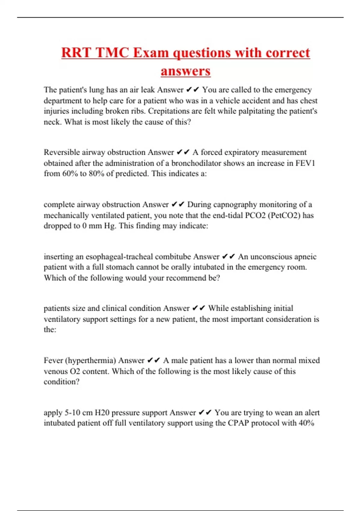 The patient's lung has an air leak Answer You are called to the emergency department to help care for a patient who was in a vehicle accident and has chest injuries including broken ribs. Crepitations are felt while palpitating the patient's neck. What is most likely the cause of this? Reversible airway obstruction Answer A forced expiratory measurement obtained after the administration of a bronchodilator shows an increase in FEV1 from 60% to 80% of predicted. This indicates a: complete airway obstruction Answer During capnography monitoring of a mechanically ventilated patient, you note that the end-tidal PCO2 (PetCO2) has dropped to 0 mm Hg. This finding may indicate: inserting an esophageal-tracheal combitube Answer An unconscious apneic patient with a full stomach cannot be orally intubated in the emergency room. Which of the following would your recommend be? patients size and clinical condition Answer While establishing initial ventilatory support settings for a new patient, the most important consideration is the: Fever (hyperthermia) Answer A male patient has a lower than normal mixed venous O2 content. Which of the following is the most likely cause of this condition?