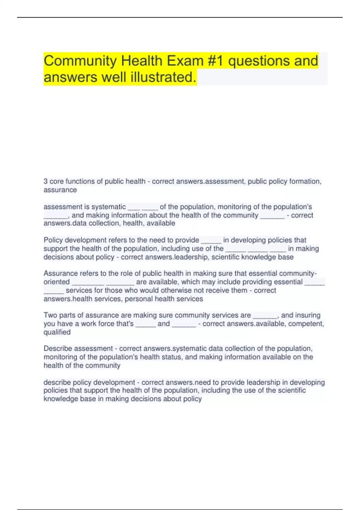 Community Health Exam #1 questions and answers well illustrated. 3 core functions of public health - correct sment, public policy formation, assurance assessment is systematic ___ ____ of the population, monitoring of the population's ______, and making information about the health of the community ______ - correct collection, health, available Policy development refers to the need to provide _____ in developing policies that support the health of the population, including use of the _____ _____ ____ in making decisions about policy - correct rship, scientific knowledge base Assurance refers to the role of public health in making sure that essential community-oriented ________ _______ are available, which may include providing essential _____ _____ services for those who would otherwise not receive them - correct h services, personal health services Two parts of assurance are making sure community services are ______, and insuring you have a work force that's _____ and ______ - correct able, competent, qualified Describe assessment - correct matic data collection of the population, monitoring of the population's health status, and making information available on the health of the community describe policy development - correct to provide leadership in developing policies that support the health of the population, including the use of the scientific knowledge base in making decisions about policy Two parts of assurance - correct answers.1. making sure community-oriented health services are available, 2. insuring community has a work force that's qualified and competent PHN providing an education program about the dangers of smoking is an example of what level of prevention? - correct ry PHN providing an flu vaccination program in a community retirement village would be an example of what type of prevention? - correct dary PHN providing a diabetes clinic for a defined population of adults in a low-income housing community. - correct ary ____ ____ is what members of a society do collectively to ensure that conditions exist in which people can be healthy. - correct c health Two terms for a collection of individuals who share one or more personal or environmental characteristics. - correct ation, aggregate Definition of population/aggregate - correct ction of individuals who share one or more personal or environmental characteristics Identifying autoimmune people in a community as at increased risk for west nile virus would be an example of identifying what? - correct pulation Essential PH Services: List examples of diagnosing and investigating health problems and hazards in the community - correct paint, trash, uneven concrete, poor playground equipment Essential PH Services: Give examples of community-based health education - correct answers.Eddy Eagle (children and guns), fall prevention education in senior housing, school lunch programs, hand hygiene Essential PH services: list examples of enforcing laws that protect health and ensure safety - correct cing immunization laws, food transportation safety laws The term "population" can be used interchangeably with what term? - correct gate 3 factors that can define community - correct e, place, function (place can be a place in time as well as geographical) 2 categories in the Consensus Set of Indicators for assessing community health status are indicators of health ______ ______ and indicators of ______ ______ - correct s outcome, risk factors 3 characteristics/dimensions of community health - correct s, structure, process 3 components within the "status" dimension of community health - correct answers.Physical, emotional, social Examples of status measures of community health that would encompass all three (physical, emotional, social) effects. - correct r absenteeism, infant mortality rates Give some examples of indicators of health status outcome within the "Consensus Set of Indicators..." - correct -specific and ethnicity-specific infant mortality, death rates and disease rates per 100K population List five indicators of risk factors within the "consensus set of indicators for assessing community health status" - correct answers.1. Low birth weight, 2. Births to adolescents, 3. prenatal care, 4. childhood poverty 5. persons living in bad air quality Community nursing diagnosis consists of three parts: 1. ____ _____ identifies specific problem faced by community, 2. ______ specifies community nurse will be working with, 3. ____ ____ identifies factors contributing to the problem - correct of, among, related to In a community nursing diagnosis, "risk of" identifies what? - correct fic problem faced by community In a community nursing diagnosis, "among" refers to what? - correct nity the nurse will be working with in relation to the identified problem In a community nursing diagnosis, "related to" identifies what? - correct rs contributing to the problem What is probably the biggest issue in assessment? - correct ng entry, then once entry is attained, negotiation A locality-based entity, composed of systems of formal organizations reflecting societal institutions, informal groups, and aggregates that are interdependent and whose function or expressed intent is to meet a wide variety of collective needs - correct nity The planning phase includes analyzing and establishing ________ among community health problems, establishing ______ and objectives and identifying _______ activities that will accomplish the objectives. - correct ities, goals, intervention Transforming a plan for improved community health into achievement of goals and objectives is _________ - correct vention Federal income poverty guidelines include what three factors? - correct y size, age of head of household, number of children in household under 18 years of age Difference in AFDC and TANF - correct answers.AFDC - moms never had to seek employment 4 reasons why one leaves poverty are too ______ to stay, a vision or a ______, a key ________, and a special _____ or ______ - 