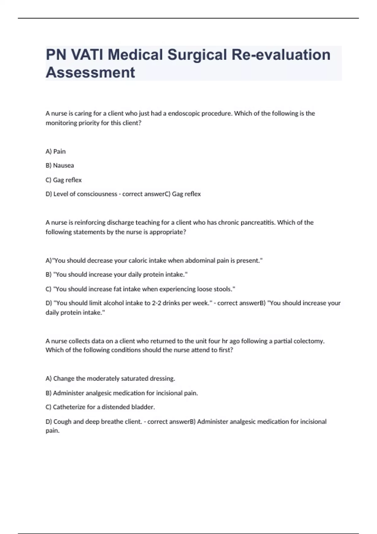 A nurse is caring for a client who just had a endoscopic procedure. Which of the following is the monitoring priority for this client? A) Pain B) Nausea C) Gag reflex D) Level of consciousness - correct answerC) Gag reflex A nurse is reinforcing discharge teaching for a client who has chronic pancreatitis. Which of the following statements by the nurse is appropriate? A)"You should decrease your caloric intake when abdominal pain is present." B) "You should increase your daily protein intake." C) "You should increase fat intake when experiencing loose stools." D) "You should limit alcohol intake to 2-2 drinks per week." - correct answerB) "You should increase your daily protein intake." A nurse collects data on a client who returned to the unit four hr ago following a partial colectomy. Which of the following conditions should the nurse attend to first? A) Change the moderately saturated dressing. B) Administer analgesic medication for incisional pain. C) Catheterize for a distended bladder. D) Cough and deep breathe client. - correct answerB) Administer analgesic medication for incisional pain.