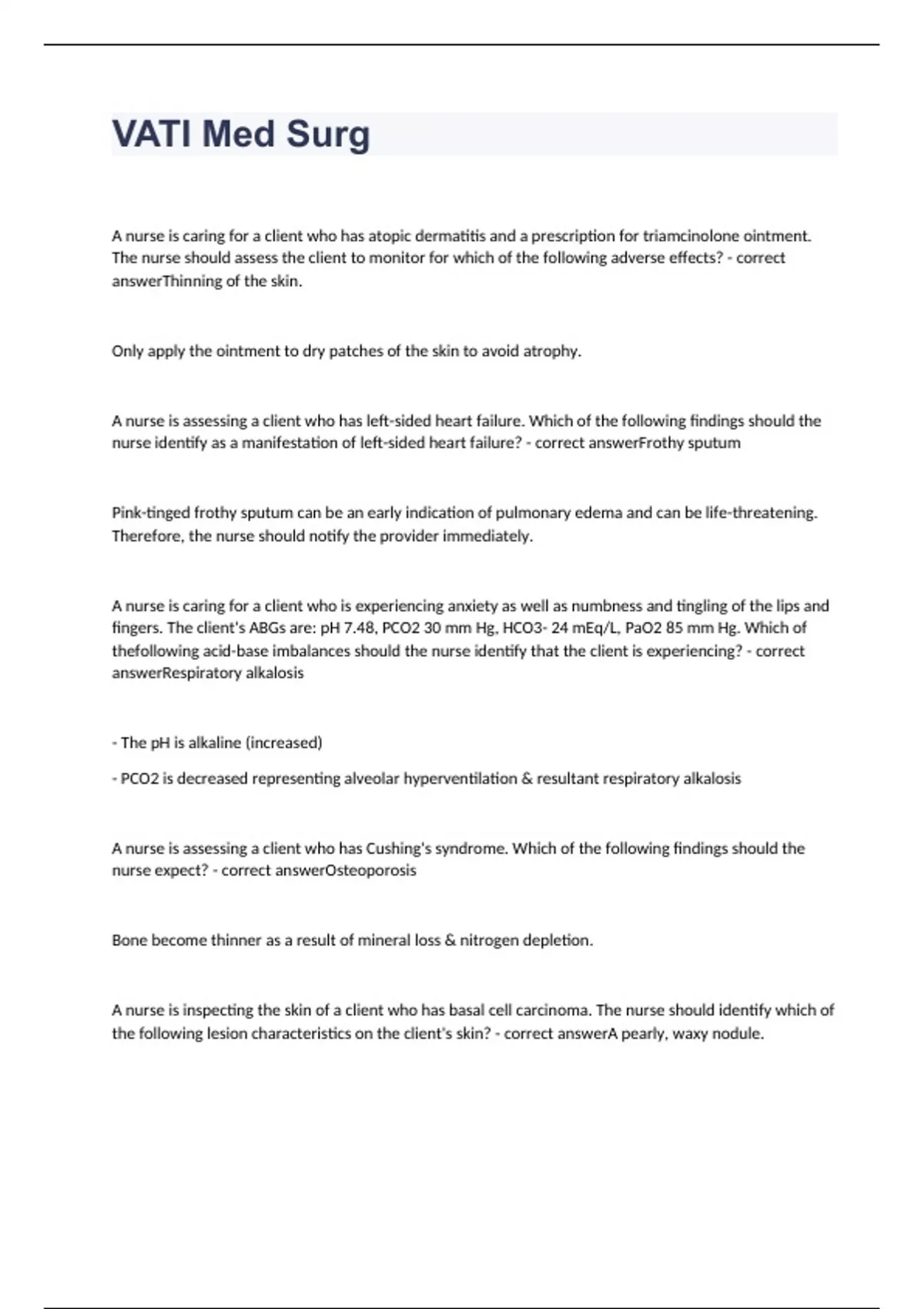 A nurse is caring for a client who has atopic dermatitis and a prescription for triamcinolone ointment. The nurse should assess the client to monitor for which of the following adverse effects? - correct answerThinning of the skin. Only apply the ointment to dry patches of the skin to avoid atrophy. A nurse is assessing a client who has left-sided heart failure. Which of the following findings should the nurse identify as a manifestation of left-sided heart failure? - correct answerFrothy sputum Pink-tinged frothy sputum can be an early indication of pulmonary edema and can be life-threatening. Therefore, the nurse should notify the provider immediately. A nurse is caring for a client who is experiencing anxiety as well as numbness and tingling of the lips and fingers. The client's ABGs are: pH 7.48, PCO2 30 mm Hg, HCO3- 24 mEq/L, PaO2 85 mm Hg. Which of thefollowing acid-base imbalances should the nurse identify that the client is experiencing? - correct answerRespiratory alkalosis - The pH is alkaline (increased) - PCO2 is decreased representing alveolar hyperventilation & resultant respiratory alkalosis A nurse is assessing a client who has Cushing's syndrome. Which of the following findings should the nurse expect? - correct answerOsteoporosis Bone become thinner as a result of mineral loss & nitrogen depletion. A nurse is inspecting the skin of a client who has basal cell carcinoma. The nurse should identify which of the following lesion characteristics on the client's skin? - correct answerA pearly, waxy nodule.
