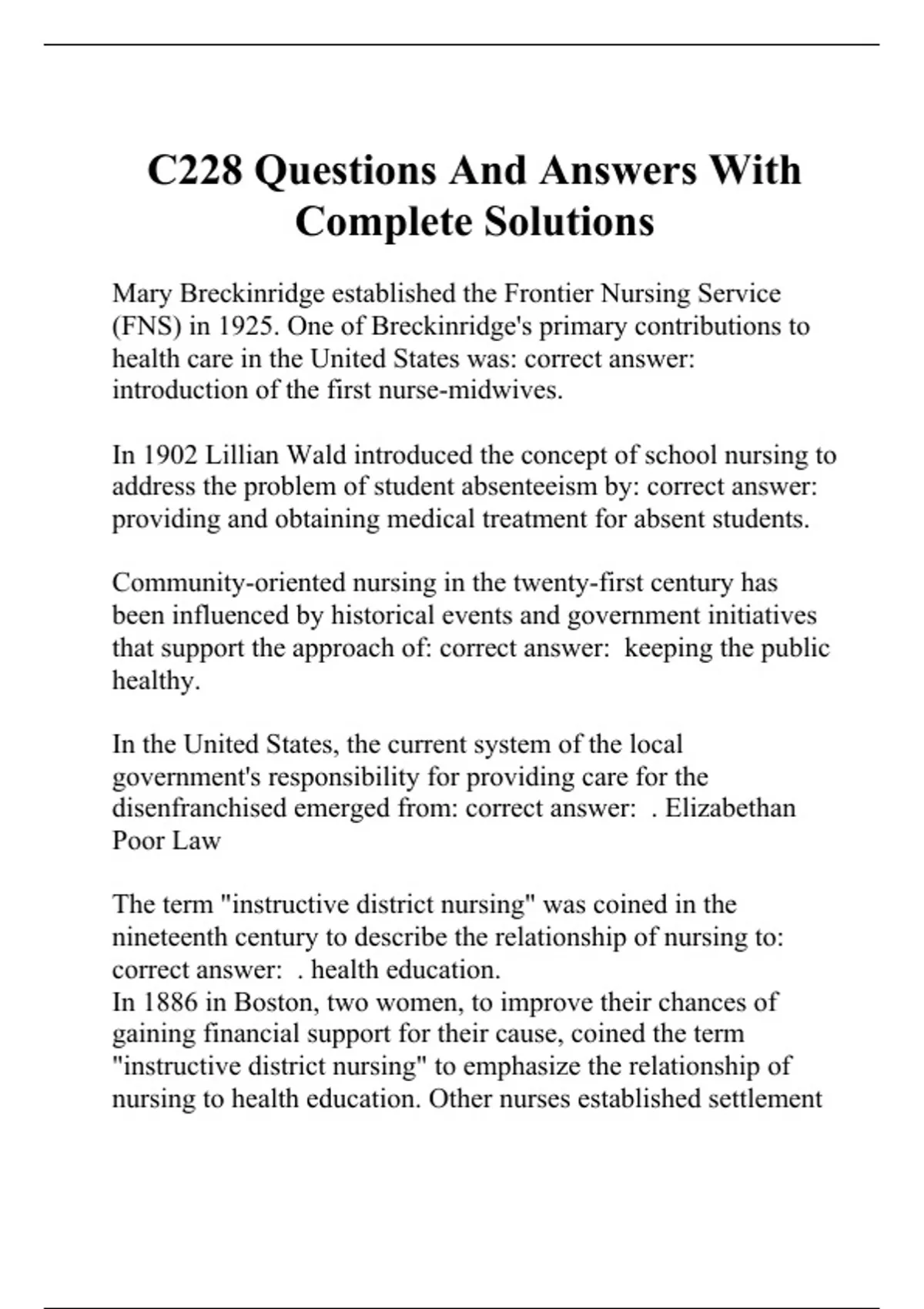 Mary Breckinridge established the Frontier Nursing Service (FNS) in 1925. One of Breckinridge's primary contributions to health care in the United States was: correct answer: introduction of the first nurse-midwives. In 1902 Lillian Wald introduced the concept of school nursing to address the problem of student absenteeism by: correct answer: providing and obtaining medical treatment for absent students. Community-oriented nursing in the twenty-first century has been influenced by historical events and government initiatives that support the approach of: correct answer: keeping the public healthy. In the United States, the current system of the local government's responsibility for providing care for the disenfranchised emerged from: correct answer: . Elizabethan Poor Law The term "instructive district nursing" was coined in the nineteenth century to describe the relationship of nursing to: correct answer: . health education. In 1886 in Boston, two women, to improve their chances of gaining financial support for their cause, coined the term "instructive district nursing" to emphasize the relationship of nursing to health education. Other nurses established settlement houses and neighborhood centers, which became hubs for health care and social welfare programs. Home health and visiting nursing evolved at a later time. The public health nurse deals with the examination of a community setting to determine the community's health status. Which of the following activities should be considered in the assessment phase? Select all that apply: correct answer: Collecting, analyzing, and disseminating information Evaluating the social, economic, and environmental characteristics of the population Questioning the availability of health services to the community The core public health function of assessment includes the following: Engaging in activities that involve the collection, analysis, and dissemination of information on both the health and health-relevant aspects of a community or specific popu
