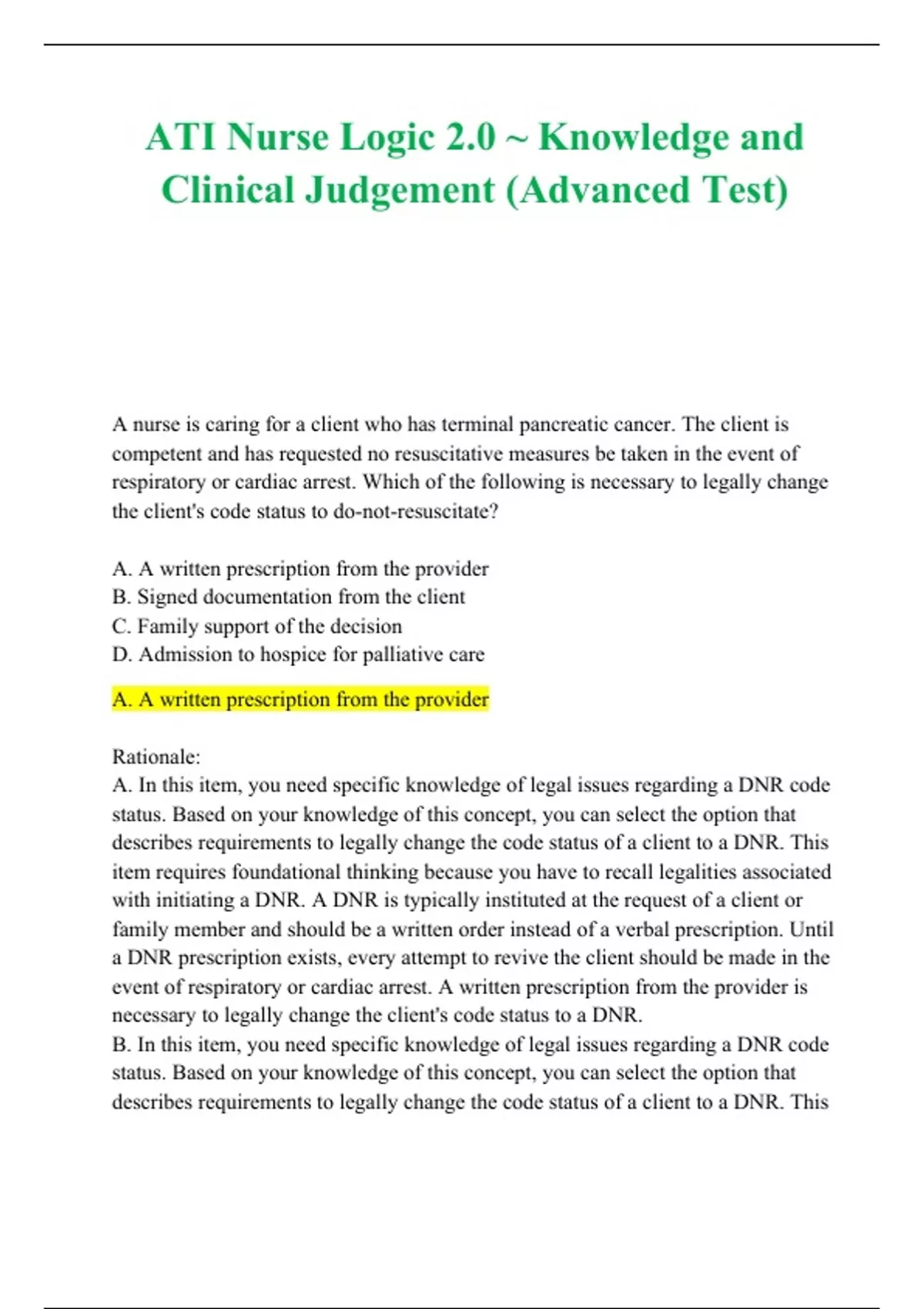 ATI Nurse Logic 2.0 ~ Knowledge and Clinical Judgement (Advanced Test)