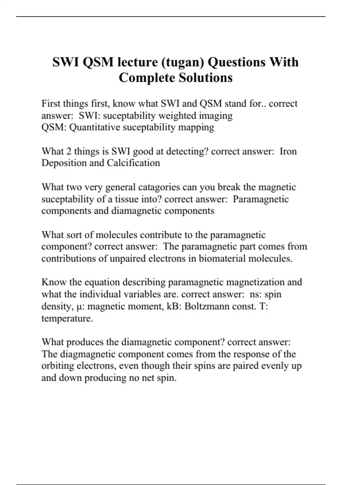 First things first, know what SWI and QSM stand for.. correct answer: SWI: suceptability weighted imaging QSM: Quantitative suceptability mapping What 2 things is SWI good at detecting? correct answer: Iron Deposition and Calcification What two very general catagories can you break the magnetic suceptability of a tissue into? correct answer: Paramagnetic components and diamagnetic components What sort of molecules contribute to the paramagnetic component? correct answer: The paramagnetic part comes from contributions of unpaired electrons in biomaterial molecules. Know the equation describing paramagnetic magnetization and what the individual variables are. correct answer: ns: spin density, μ: magnetic moment, kB: Boltzmann const. T: temperature. What produces the diamagnetic component? correct answer: The diagmagnetic component comes from the response of the orbiting electrons, even though their spins are paired evenly up and down producing no net spin. Know the equation describing the magnetization and what the variables represent correct answer: ne: spin density, qe: charge, me: mass, r: radius Know what happens (susceptibility wise) to Hg when it becomes oxygenated/deoxygenated correct answer: - Hemoglobin changes susceptibility from diamagnetic to paramagnetic as it becomes deoxygenated. - The oxygen binds with iron (III) in hemoglobin and pairs all electrons, making oxyhemoglobin diamagnetic.