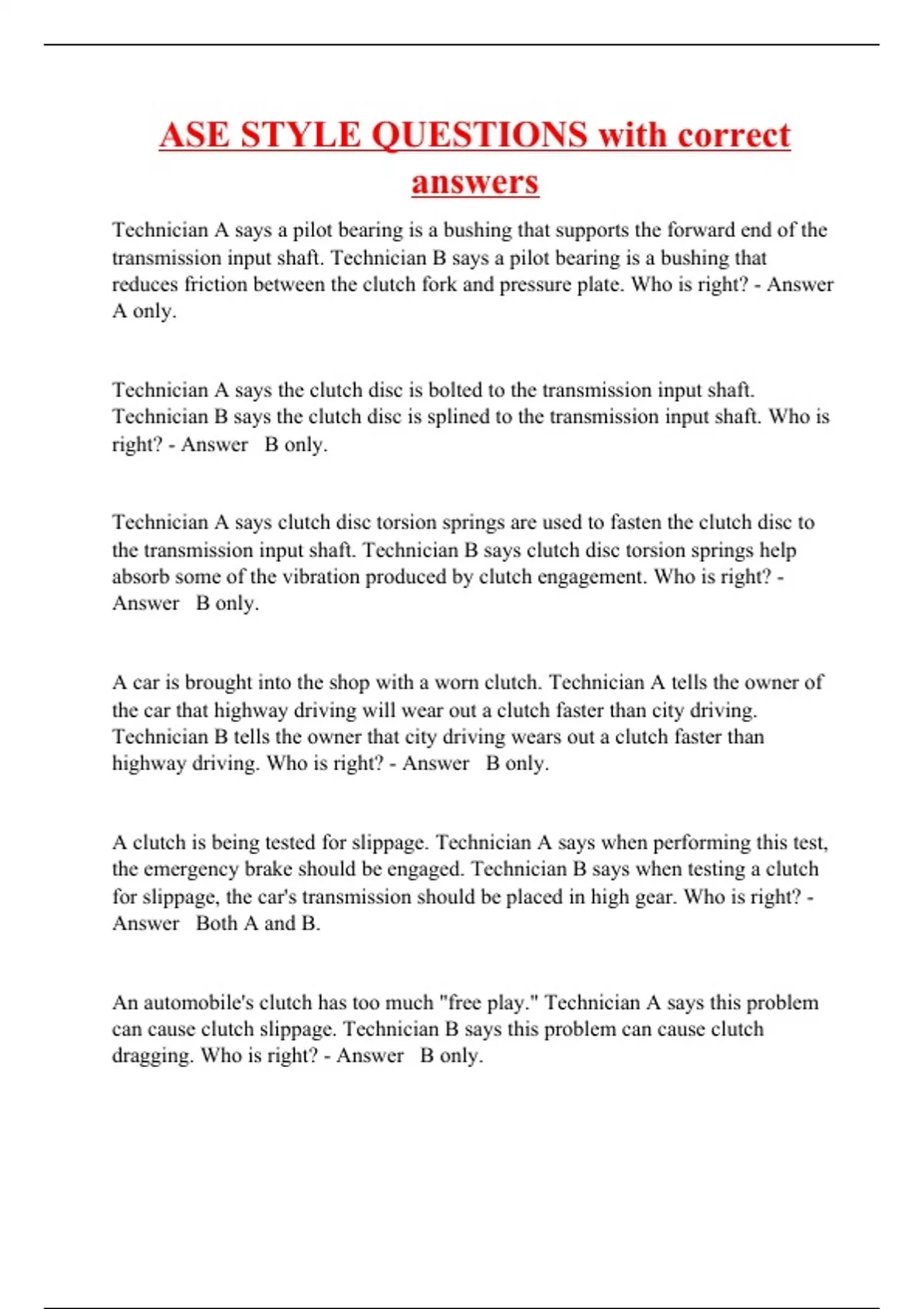 Technician A says a pilot bearing is a bushing that supports the forward end of the transmission input shaft. Technician B says a pilot bearing is a bushing that reduces friction between the clutch fork and pressure plate. Who is right? - Answer A only. Technician A says the clutch disc is bolted to the transmission input shaft. Technician B says the clutch disc is splined to the transmission input shaft. Who is right? - Answer B only. Technician A says clutch disc torsion springs are used to fasten the clutch disc to the transmission input shaft. Technician B says clutch disc torsion springs help absorb some of the vibration produced by clutch engagement. Who is right? - Answer B only. A car is brought into the shop with a worn clutch. Technician A tells the owner of the car that highway driving will wear out a clutch faster than city driving. Technician B tells the owner that city driving wears out a clutch faster than highway driving. Who is right? - Answer B only. A clutch is being tested for slippage. Technician A says when performing this test, the emergency brake should be engaged. Technician B says when testing a clutch for slippage, the car's transmission should be placed in high gear. Who is right? - Answer Both A and B. An automobile's clutch has too much "free play." Technician A says this problem can cause clutch slippage. Technician B says this problem can cause clutch dragging. Who is right? - Answer B only.