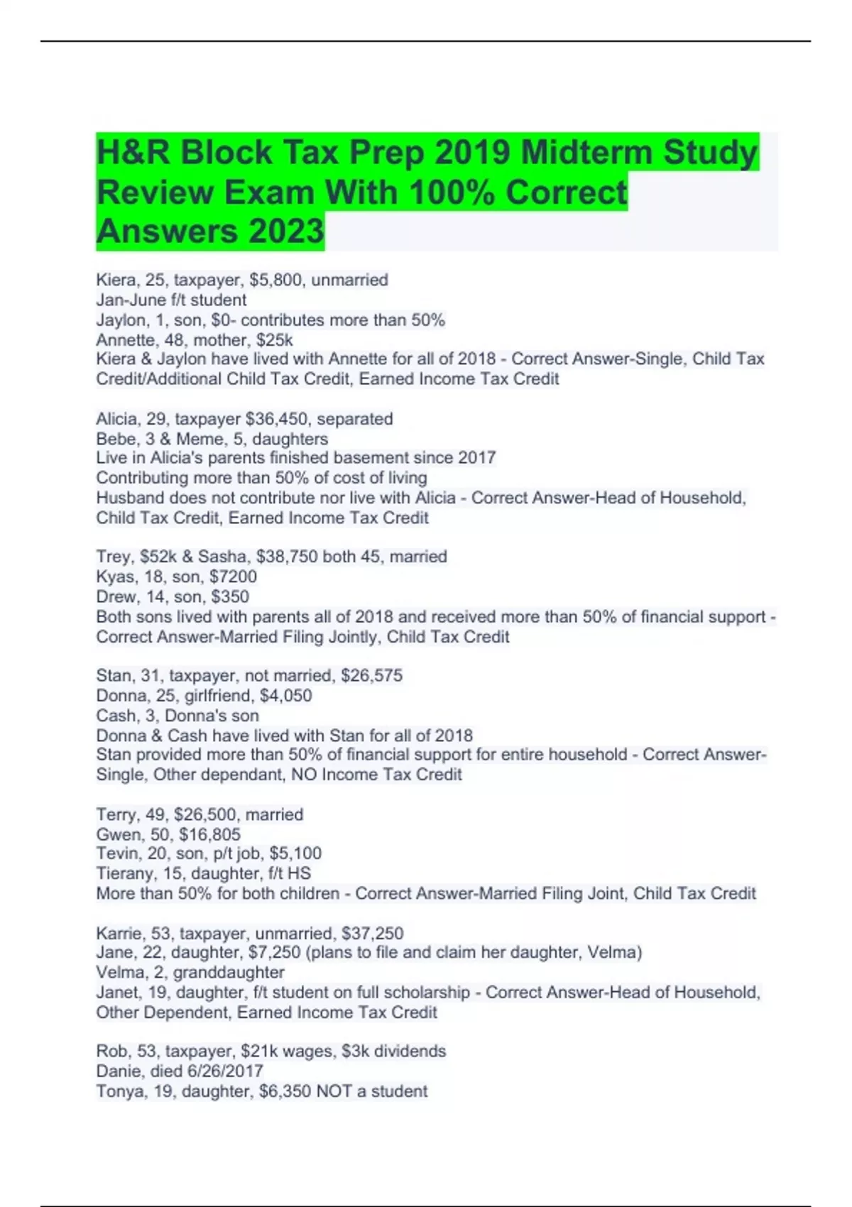 H&R Block Tax Prep 2019 Midterm Study Review Exam With 100% Correct Answers 2023