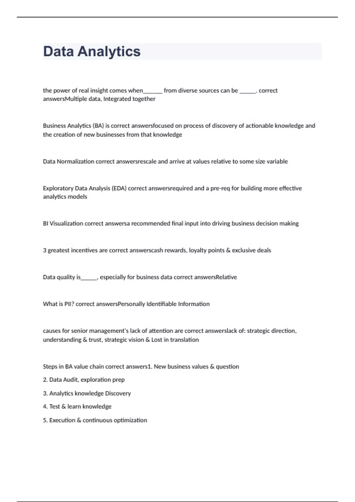 the power of real insight comes when______ from diverse sources can be _____. correct answersMultiple data, Integrated together Business Analytics (BA) is correct answersfocused on process of discovery of actionable knowledge and the creation of new businesses from that knowledge Data Normalization correct answersrescale and arrive at values relative to some size variable Exploratory Data Analysis (EDA) correct answersrequired and a pre-req for building more effective analytics models BI Visualization correct answersa recommended final input into driving business decision making 3 greatest incentives are correct answerscash rewards, loyalty points & exclusive deals Data quality is_____, especially for business data correct answersRelative What is PII? correct answersPersonally Identifiable Information causes for senior management's lack of attention are correct answerslack of: strategic direction, understanding & trust, strategic vision & Lost in translation Steps in BA value chain correct answers1. New business values & question 2. Data Audit, exploration prep 3. Analytics knowledge Discovery 4. Test & learn knowledge 5. Execution & continuous optimization