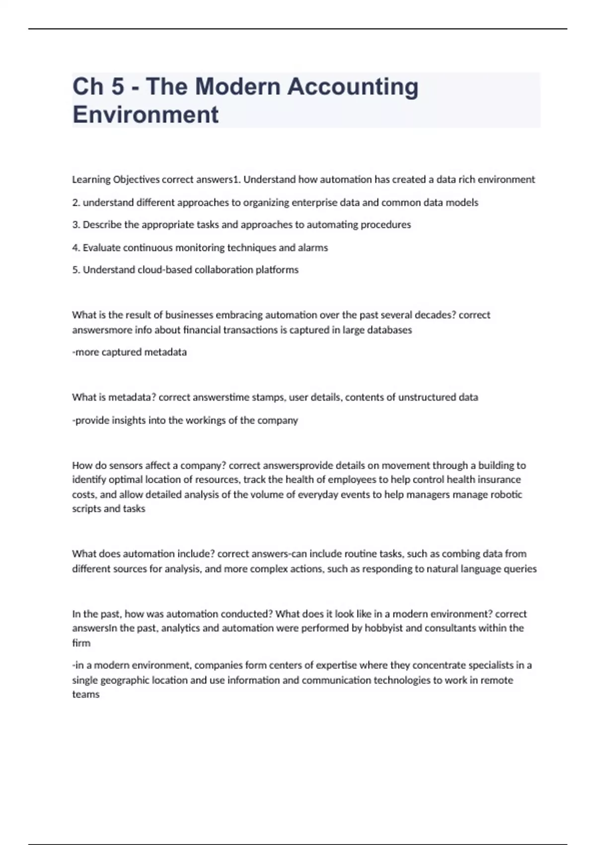 Learning Objectives correct answers1. Understand how automation has created a data rich environment 2. understand different approaches to organizing enterprise data and common data models 3. Describe the appropriate tasks and approaches to automating procedures 4. Evaluate continuous monitoring techniques and alarms 5. Understand cloud-based collaboration platforms What is the result of businesses embracing automation over the past several decades? correct answersmore info about financial transactions is captured in large databases -more captured metadata What is metadata? correct answerstime stamps, user details, contents of unstructured data -provide insights into the workings of the company How do sensors affect a company? correct answersprovide details on movement through a building to identify optimal location of resources, track the health of employees to help control health insurance costs, and allow detailed analysis of the volume of everyday events to help managers manage robotic scripts and tasks What does automation include? correct answers-can include routine tasks, such as combing data from different sources for analysis, and more complex actions, such as responding to natural language queries In the past, how was automation conducted? What does it look like in a modern environment? correct answersIn the past, analytics and automation were performed by hobbyist and consultants within the firm -in a modern environment, companies form centers of expertise where they concentrate specialists in a single geographic location and use information and communication technologies to work in remote teams