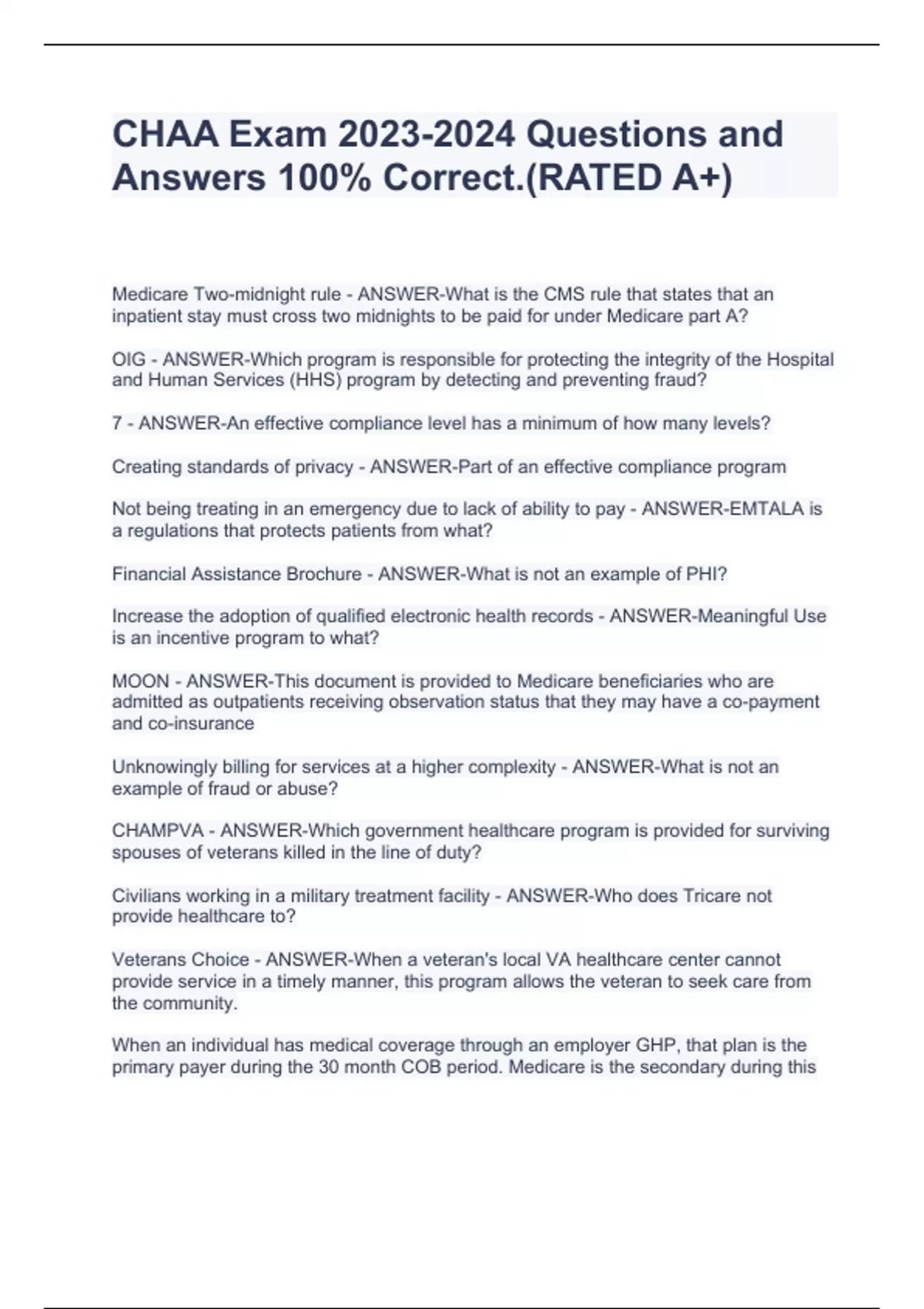 Medicare Two-midnight rule - ANSWER-What is the CMS rule that states that an inpatient stay must cross two midnights to be paid for under Medicare part A? OIG - ANSWER-Which program is responsible for protecting the integrity of the Hospital and Human Services (HHS) program by detecting and preventing fraud? 7 - ANSWER-An effective compliance level has a minimum of how many levels? Creating standards of privacy - ANSWER-Part of an effective compliance program Not being treating in an emergency due to lack of ability to pay - ANSWER-EMTALA is a regulations that protects patients from what? Financial Assistance Brochure - ANSWER-What is not an example of PHI? Increase the adoption of qualified electronic health records - ANSWER-Meaningful Use is an incentive program to what? MOON - ANSWER-This document is provided to Medicare beneficiaries who are admitted as outpatients receiving observation status that they may have a co-payment and co-insurance Unknowingly billing for services at a higher complexity - ANSWER-What is not an example of fraud or abuse?