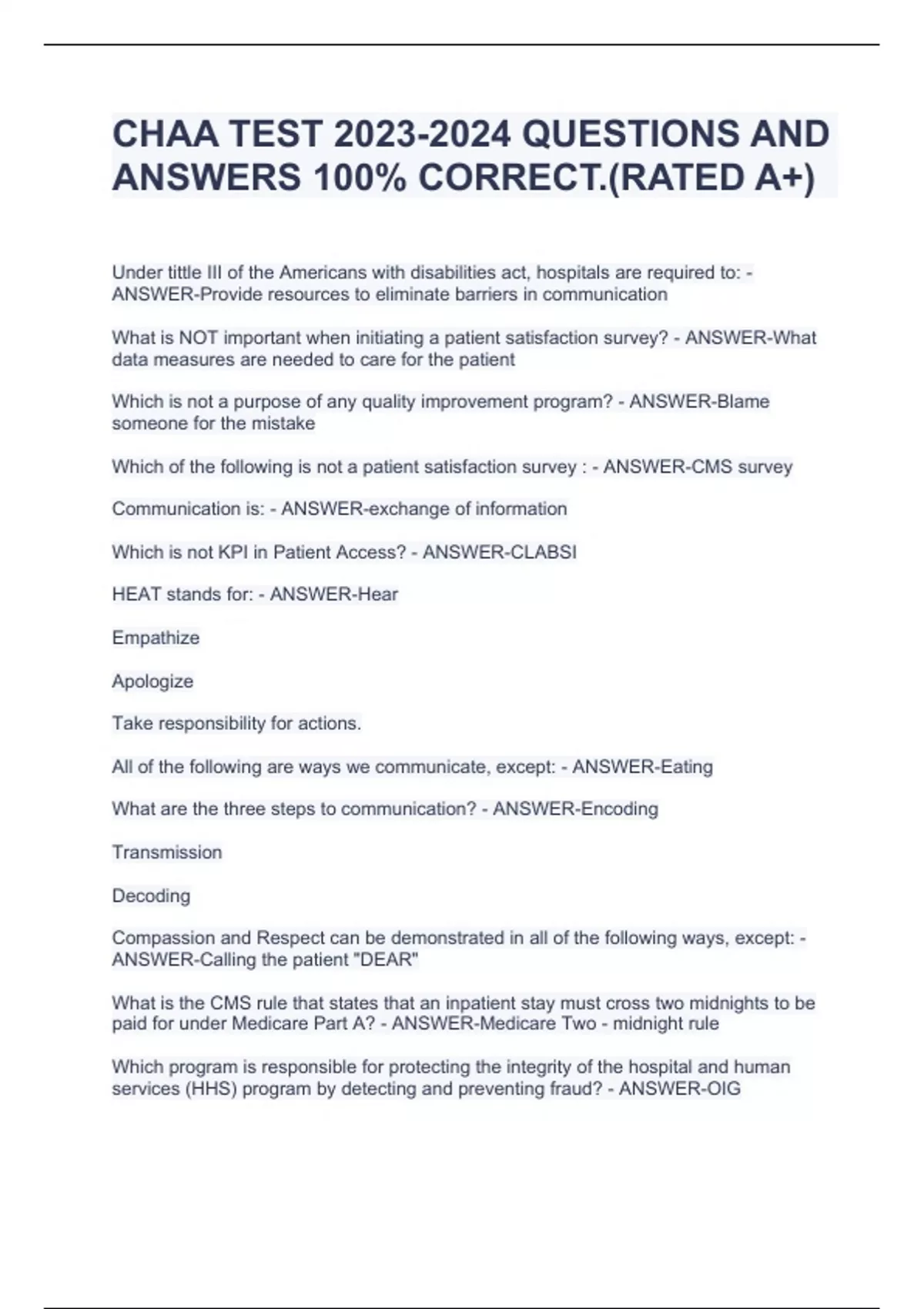 Under tittle III of the Americans with disabilities act, hospitals are required to: - ANSWER-Provide resources to eliminate barriers in communication What is NOT important when initiating a patient satisfaction survey? - ANSWER-What data measures are needed to care for the patient Which is not a purpose of any quality improvement program? - ANSWER-Blame someone for the mistake Which of the following is not a patient satisfaction survey : - ANSWER-CMS survey Communication is: - ANSWER-exchange of information Which is not KPI in Patient Access? - ANSWER-CLABSI HEAT stands for: - ANSWER-Hear Empathize Apologize Take responsibility for actions. All of the following are ways we communicate, except: - ANSWER-Eating What are the three steps to communication? - ANSWER-Encoding