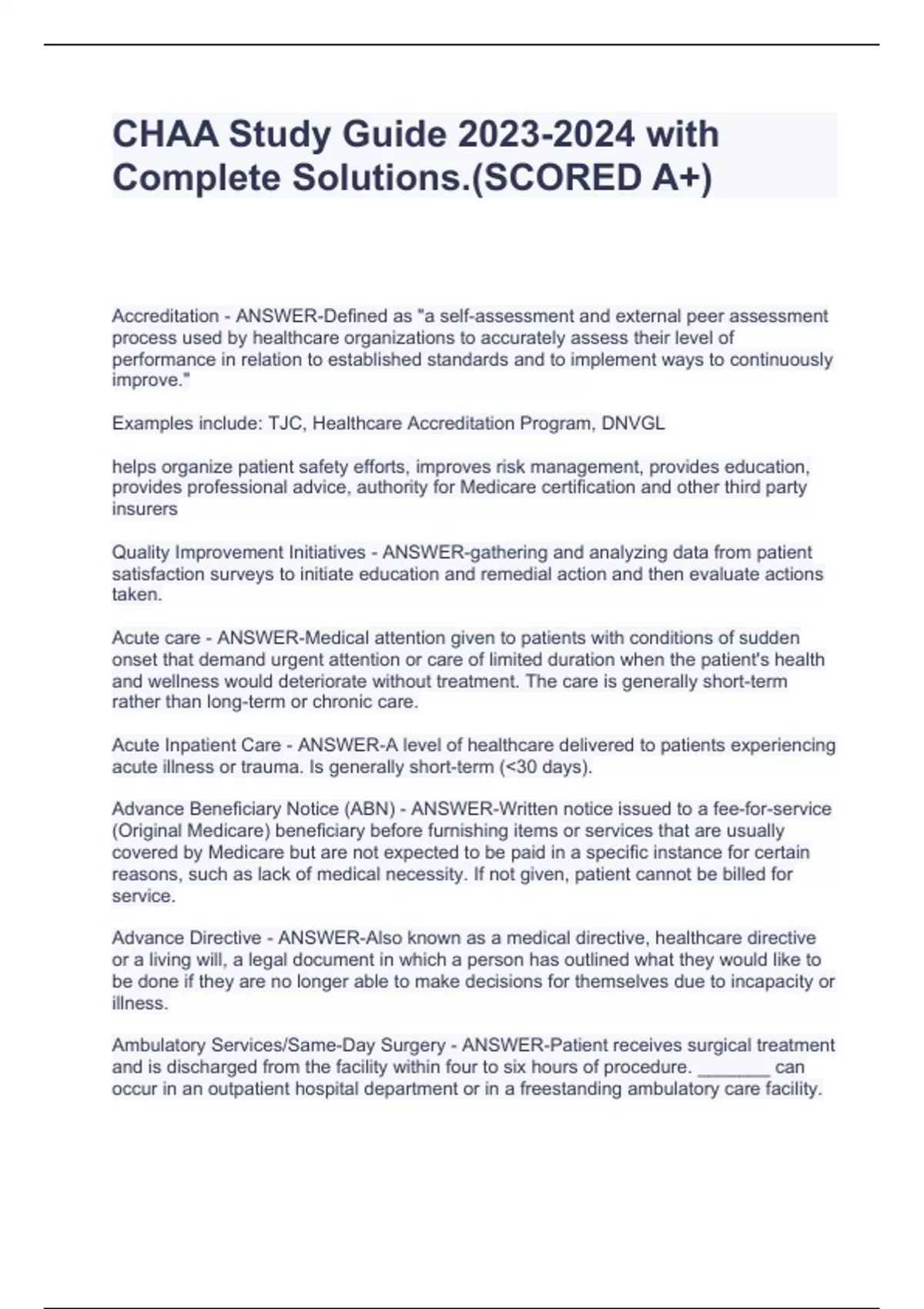 Accreditation - ANSWER-Defined as "a self-assessment and external peer assessment process used by healthcare organizations to accurately assess their level of performance in relation to established standards and to implement ways to continuously improve." Examples include: TJC, Healthcare Accreditation Program, DNVGL helps organize patient safety efforts, improves risk management, provides education, provides professional advice, authority for Medicare certification and other third party insurers Quality Improvement Initiatives - ANSWER-gathering and analyzing data from patient satisfaction surveys to initiate education and remedial action and then evaluate actions taken. Acute care - ANSWER-Medical attention given to patients with conditions of sudden onset that demand urgent attention or care of limited duration when the patient's health and wellness would deteriorate without treatment. The care is generally short-term rather than long-term or chronic care. Acute Inpatient Care - ANSWER-A level of healthcare delivered to patients experiencing acute illness or trauma. Is generally short-term (<30 days). Advance Beneficiary Notice (ABN) - ANSWER-Written notice issued to a fee-for-service (Original Medicare) beneficiary before furnishing items or services that are usually covered by Medicare but are not expected to be paid in a specific instance for certain reasons, such as lack of medical necessity. If not given, patient cannot be billed for service. Advance Directive - ANSWER-Also known as a medical directive, healthcare directive or a living will, a legal document in which a person has outlined what they would like to