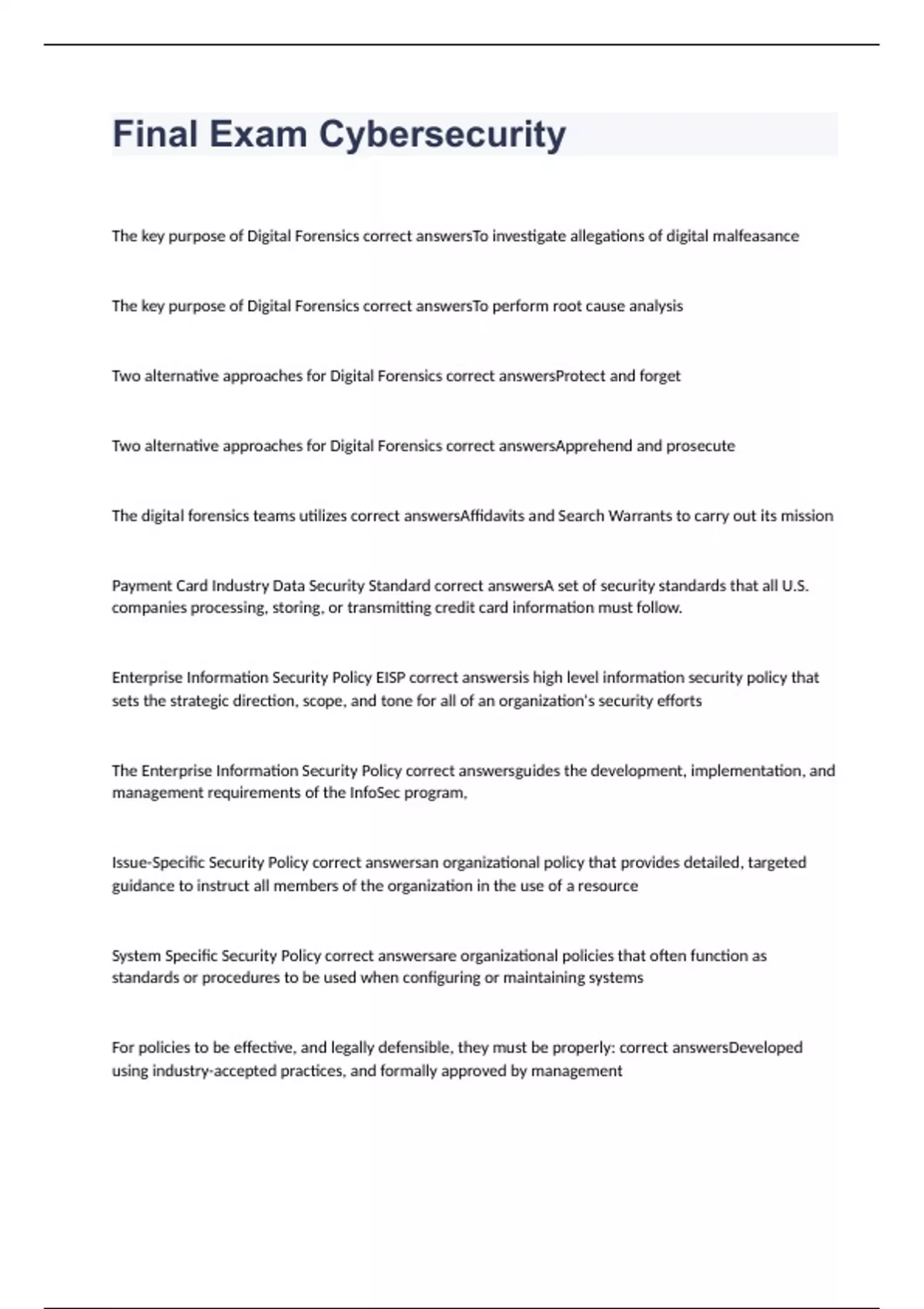 The key purpose of Digital Forensics correct answersTo investigate allegations of digital malfeasance The key purpose of Digital Forensics correct answersTo perform root cause analysis Two alternative approaches for Digital Forensics correct answersProtect and forget Two alternative approaches for Digital Forensics correct answersApprehend and prosecute The digital forensics teams utilizes correct answersAffidavits and Search Warrants to carry out its mission Payment Card Industry Data Security Standard correct answersA set of security standards that all U.S. companies processing, storing, or transmitting credit card information must follow. Enterprise Information Security Policy EISP correct answersis high level information security policy that sets the strategic direction, scope, and tone for all of an organization's security efforts The Enterprise Information Security Policy correct answersguides the development, implementation, and management requirements of the InfoSec program, Issue-Specific Security Policy correct answersan organizational policy that provides detailed, targeted guidance to instruct all members of the organization in the use of a resource System Specific Security Policy correct answersare organizational policies that often function as standards or procedures to be used when configuring or maintaining systems For policies to be effective, and legally defensible, they must be properly: correct answersDeveloped using industry-accepted practices, and formally approved by management