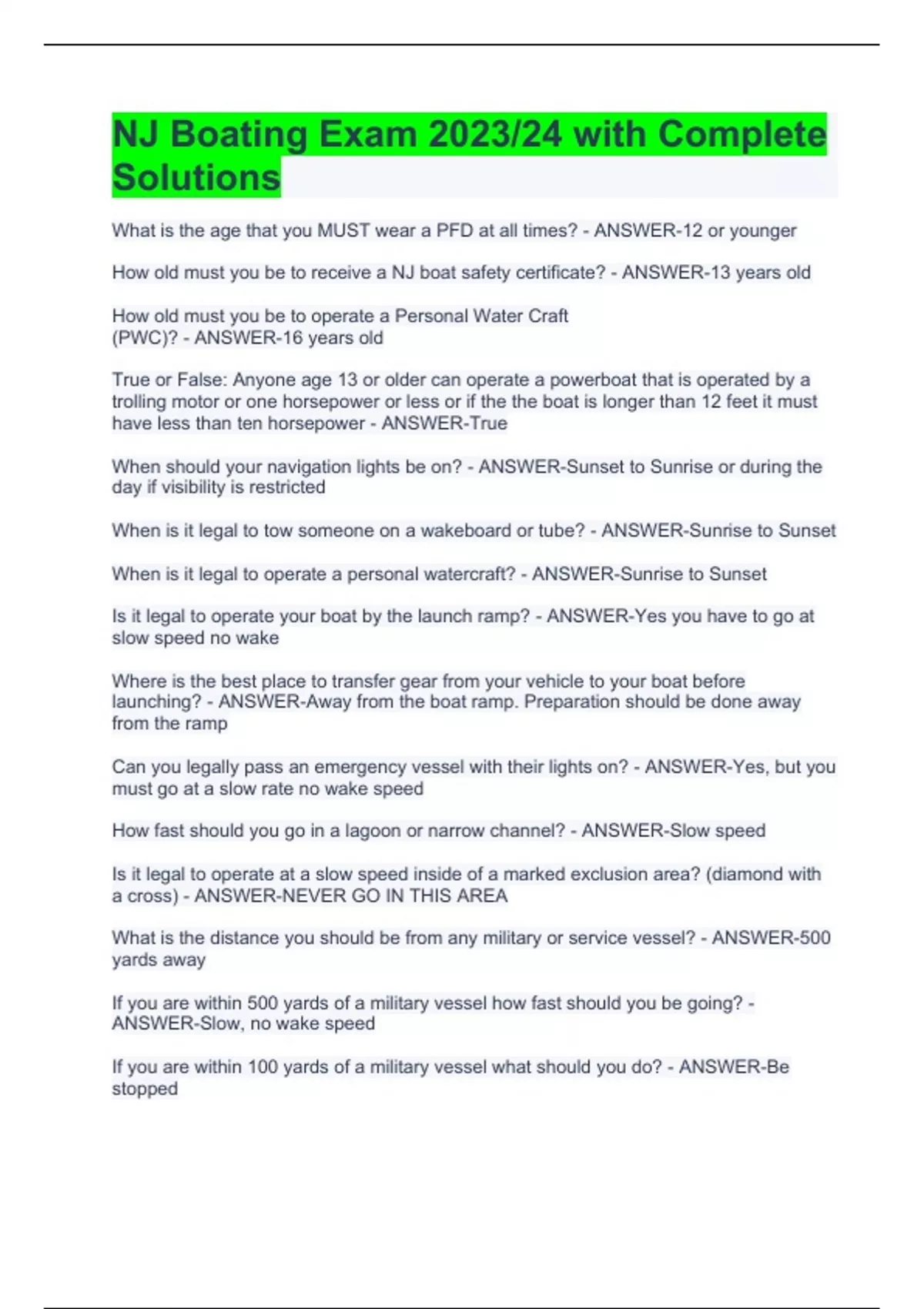 What is the age that you MUST wear a PFD at all times? - ANSWER-12 or younger How old must you be to receive a NJ boat safety certificate? - ANSWER-13 years old How old must you be to operate a Personal Water Craft (PWC)? - ANSWER-16 years old True or False: Anyone age 13 or older can operate a powerboat that is operated by a trolling motor or one horsepower or less or if the the boat is longer than 12 feet it must have less than ten horsepower - ANSWER-True When should your navigation lights be on? - ANSWER-Sunset to Sunrise or during the day if visibility is restricted When is it legal to tow someone on a wakeboard or tube? - ANSWER-Sunrise to Sunset When is it legal to operate a personal watercraft? - ANSWER-Sunrise to Sunset Is it legal to operate your boat by the launch ramp? - ANSWER-Yes you have to go at slow speed no wake Where is the best place to transfer gear from your vehicle to your boat before launching? - ANSWER-Away from the boat ramp. Preparation should be done away from the ramp Can you legally pass an emergency vessel with their lights on? - ANSWER-Yes, but you must go at a slow rate no wake speed How fast should you go in a lagoon or narrow channel? - ANSWER-Slow speed Is it legal to operate at a slow speed inside of a marked exclusion area? (diamond with a cross) - ANSWER-NEVER GO IN THIS AREA What is the distance you should be from any military or service vessel? - ANSWER-500 yards away If you are within 500 yards of a military vessel how fast should you be going? - ANSWER-Slow, no wake speed If you are within 100 yards of a military vessel what should you do? - ANSWER-Be stopped